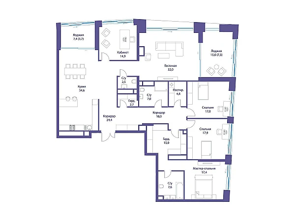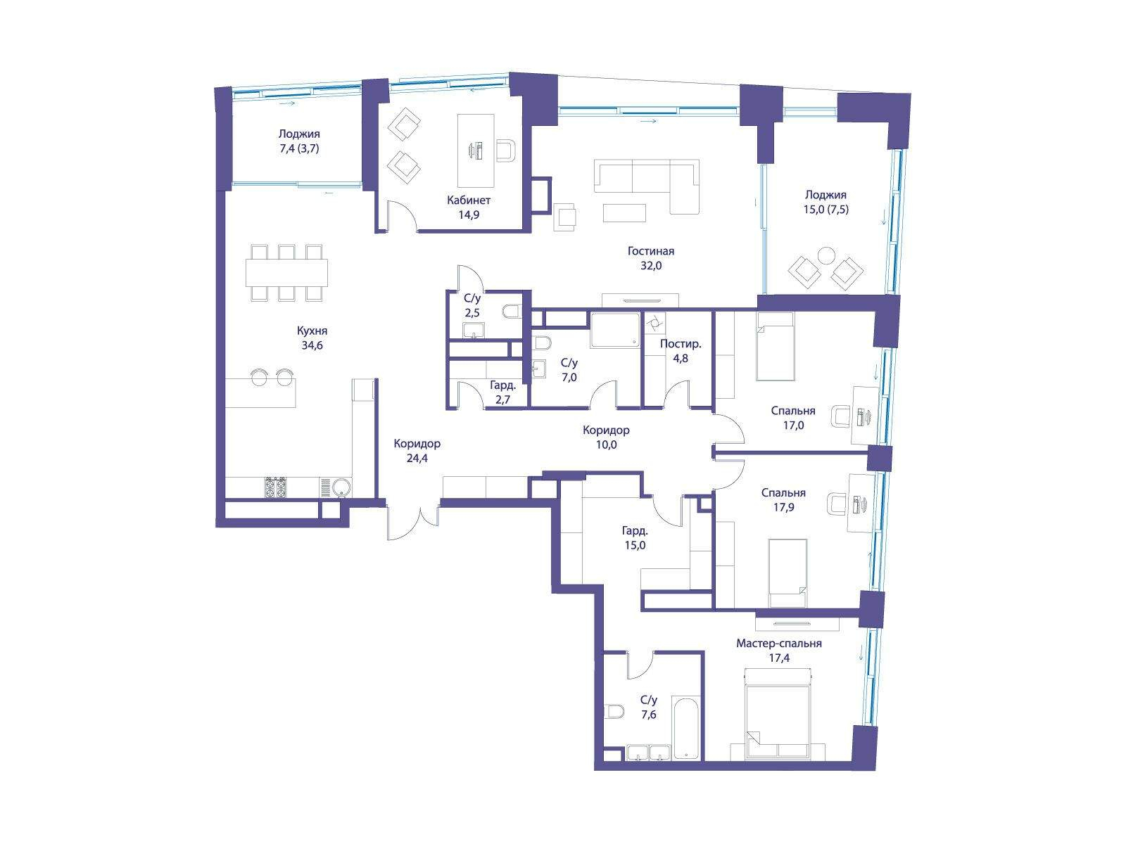 В квартире продуманная функциональная планировка с просторной кухней 34.60 м2. Жилая площадь - 99.20 м2. Высота потолка от 3,65 м. Изолированные комнаты, 3 санузла(1 раздельный и 2 совмещенных) . Окна на противоположные стороны. Виды на природный парк и реку.