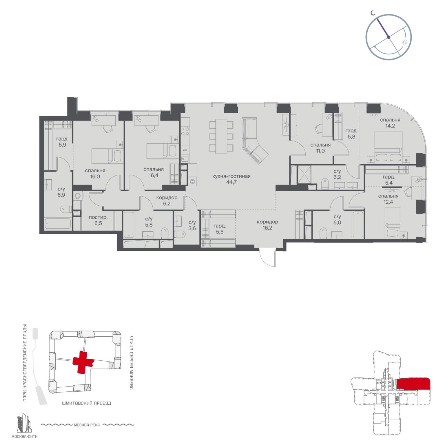 Продается просторная квартира площадью 219.00 м2 в жилом комплексе РЕКА. Квартира находится в 4 секции корпуса 3 (будет введен в эксплуатацию в 4 кв. 2026) . Этаж 12-й из 14.
