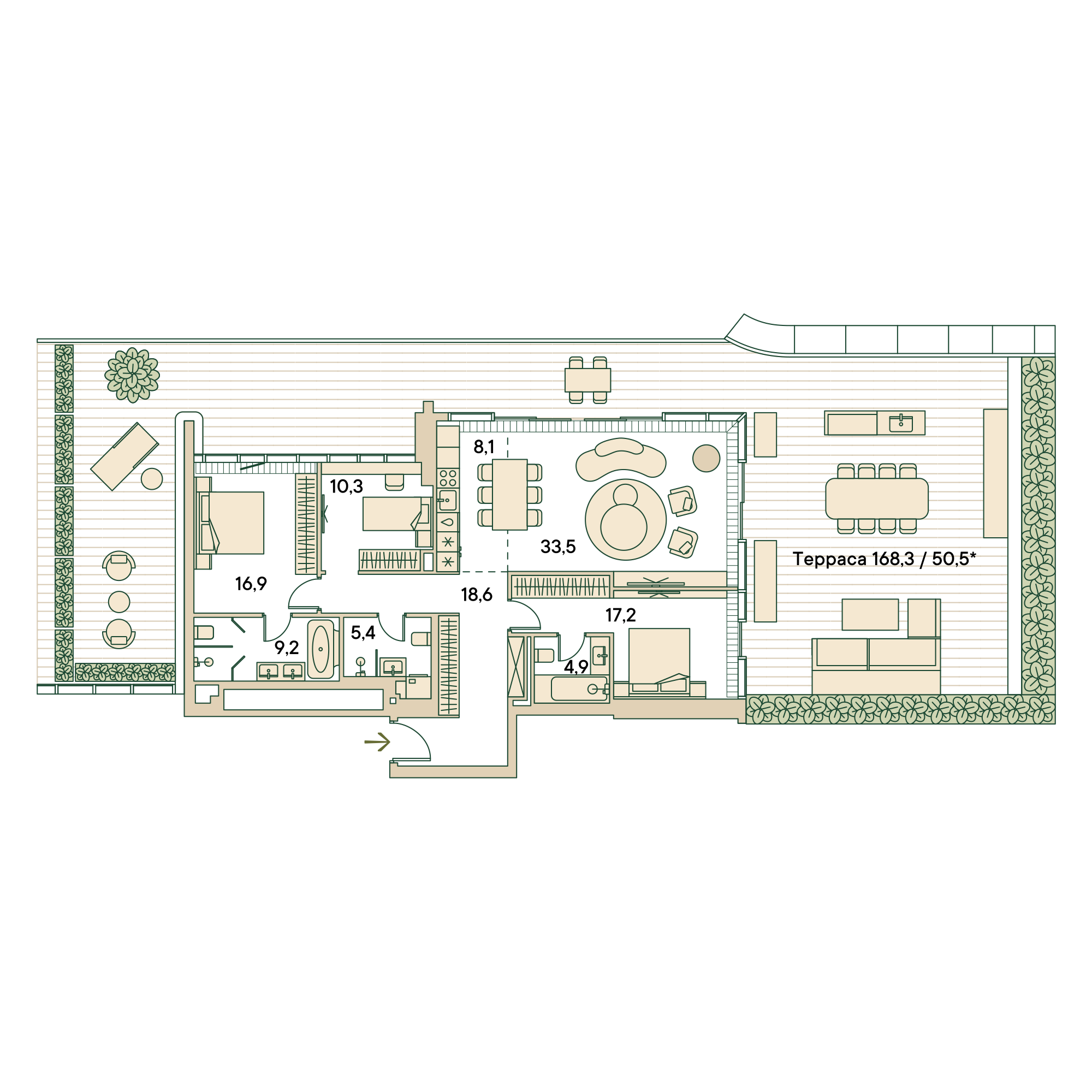 В доме представлены элитные клубные резиденции. Одна из секций целиком состоит из квартир с финишной авторской отделкой: дизайнерские интерьеры, итальянские кухни, премиальная бытовая техника и сантехника. В наличии имеются пентхаусы с террасами и каминами.