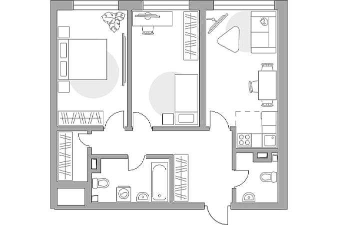 Жилая площадь 42.15 м2, кухня 2.89 м2. Площадь комнат: 14.28/13.97/13.90 м2, квартира без отделки, окна выходят на улицу.