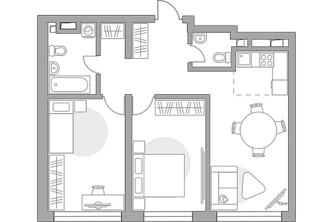 Жилая площадь 43.21 м2, кухня 4.07 м2. Площадь комнат: 15.53/14.40/13.28 м2, квартира без отделки, окна выходят во двор.