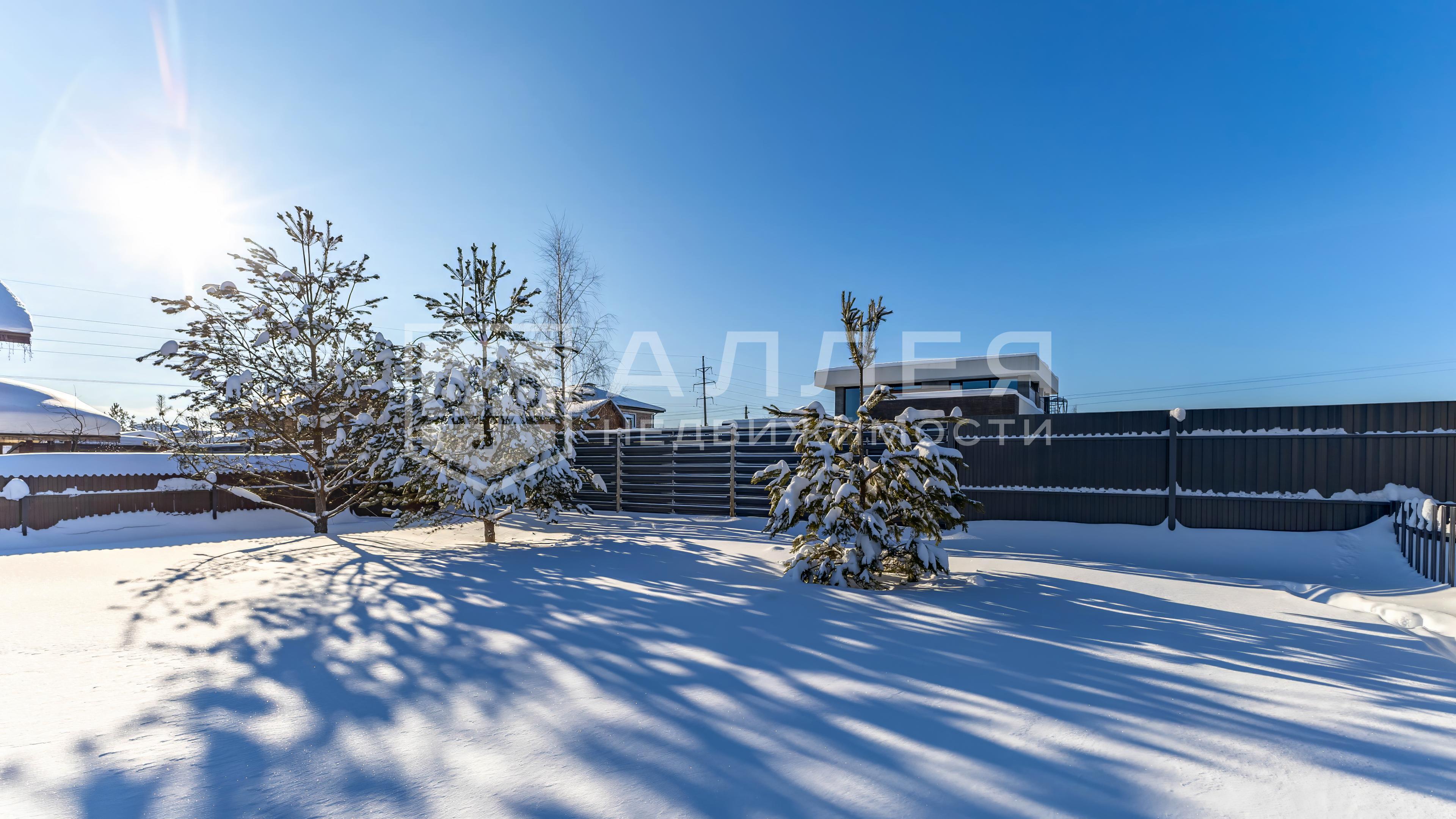 Участок правильной формы. Высажен газон, по периметру участка растут хвойные деревья. Рядом с домом построен гараж для автомобиля.