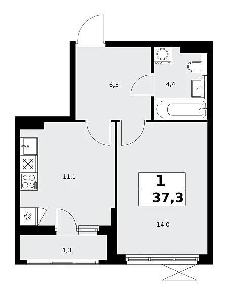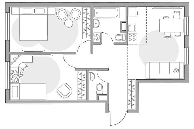 Жилая площадь 38.87 м2, кухня 2.71 м2. Площадь комнат: 13.83/12.69/12.35 м2, черновая отделка.