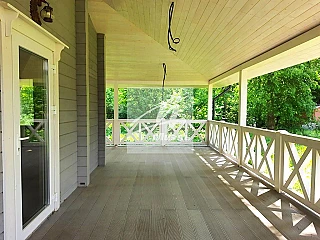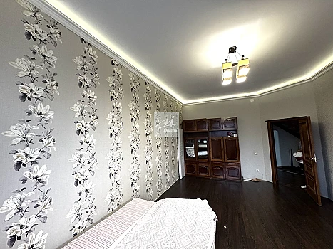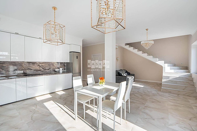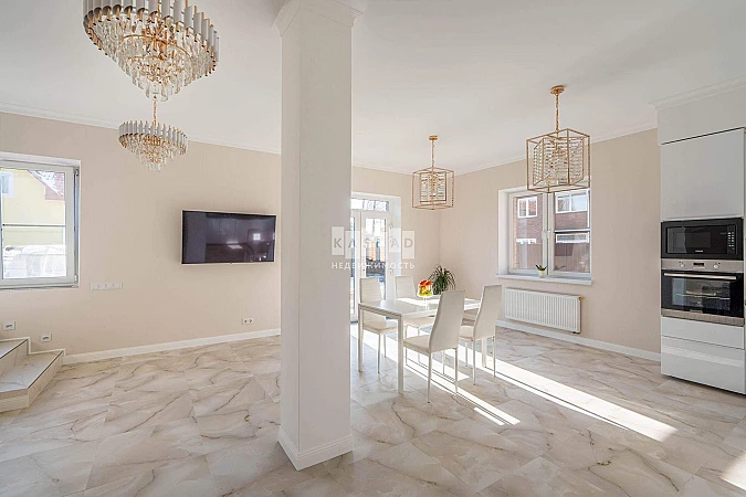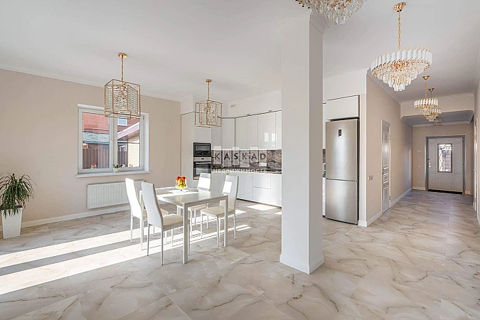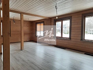 Внутренняя отделка дома выполнена в приятных спокойных тонах. Полы первого этажа отделаны керамогранитом, а в спальнях использован качественный ламинат.