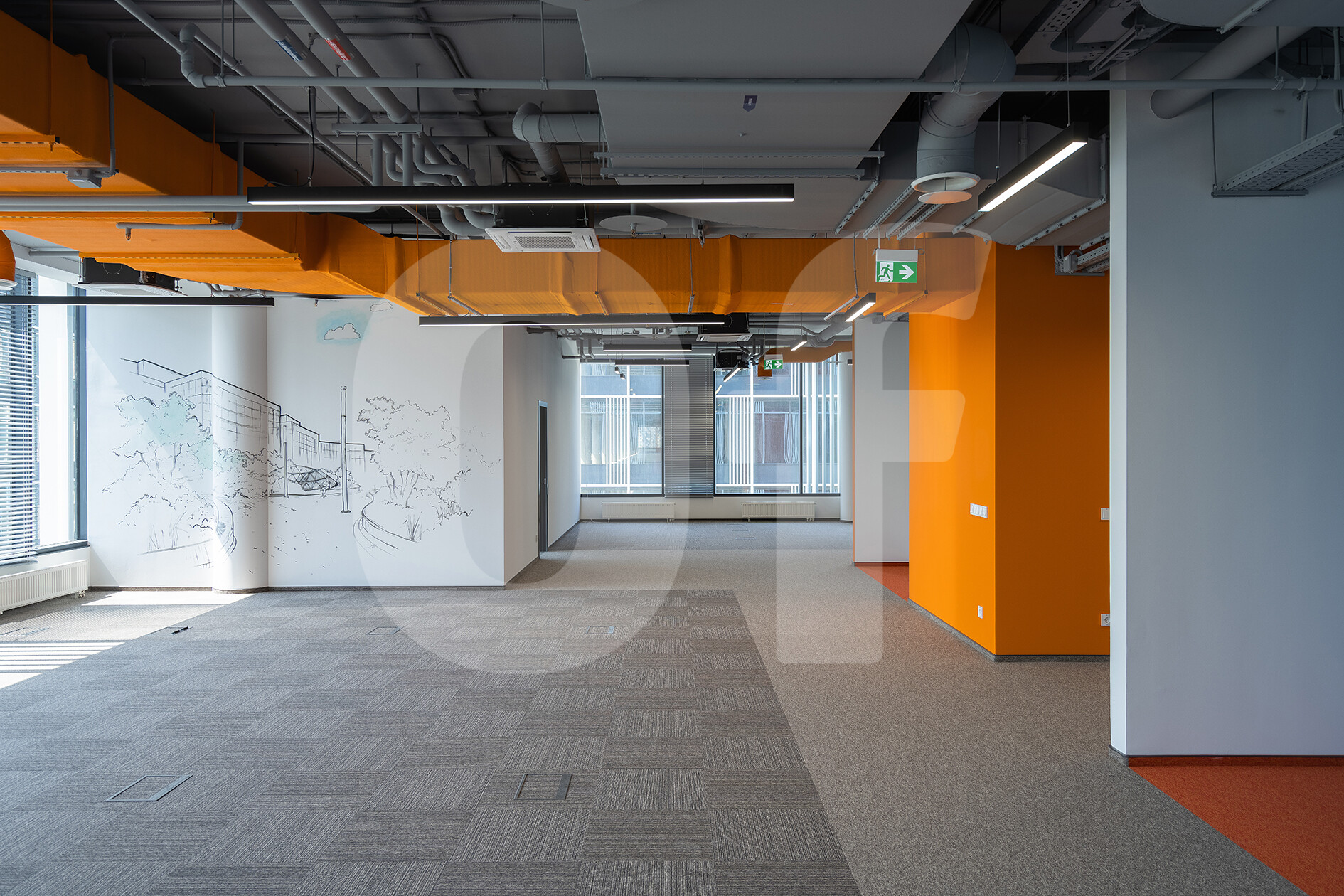Офис включает зону ресепшен, гардеробные, кабинеты руководителей, кухню, переговорные, кроссовую и санузлы. Установлены современные инженерные системы: приточно-вытяжная вентиляция, кондиционирование, электропитание через розеточные лючки в фальшполе. Подведены водопровод, канализация, СКС и отопление.