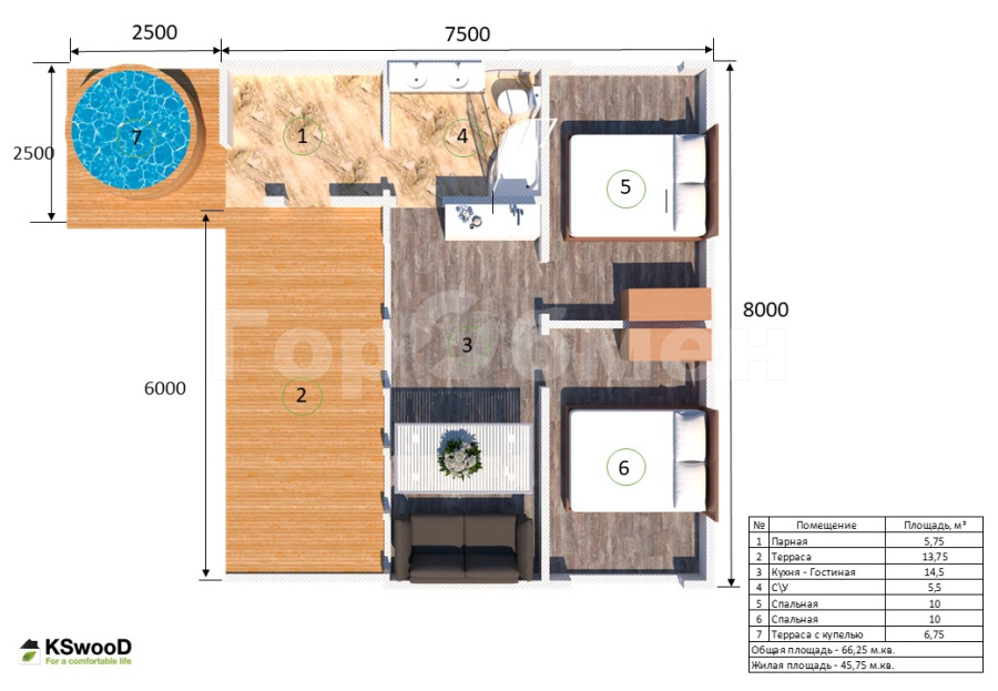 В доме две спальни (по 10 кв.м), кухня-гостиная (14,5 кв.м), совмещенный санузел (5,5 кв.м), парная (5,75 кв.м) с купелью (терраса с купелью 6,75 кв.м, купель круглогодичная, с подогревом), терраса (13,75 кв.м). Общая площадь – 66,25 кв.м, жилая площадь – 45,75 кв.м. 1 этаж.