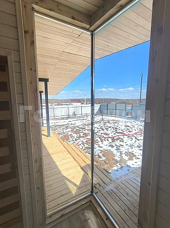 Дом каркасный на свайном фундаменте, утепление стен ППУ (бесшовное утепление). Внешняя и внутренняя отделка - имитация бруса, Безрамное остекление ПВХ.