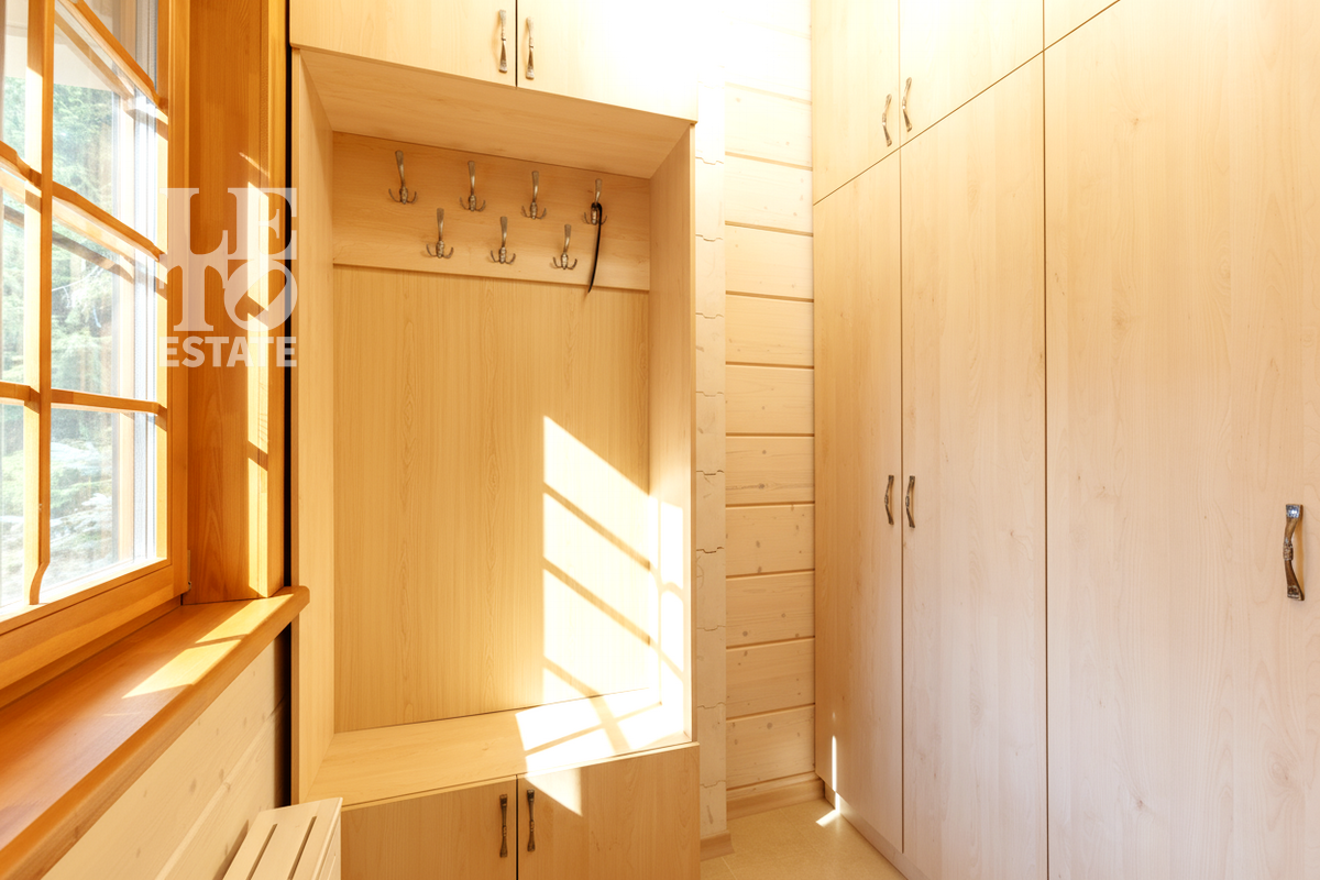 Первый этаж: прихожая, гардеробная, светлая кухня, гостиная с дровяным камином, столовая, гостевая спальня, санузел с душевой, постирочная, крытая веранда с гардеробной.