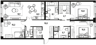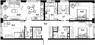 ПЛАНИРОВКА: - КУХНЯ-ГОСТИНАЯ - МАСТЕР-СПАЛЬНЯ С ВАННОЙ КОМНАТОЙ И ГАРДЕРОБНОЙ - ДВЕ КОМНАТЫ СВОБОДНОГО НАЗНАЧЕНИЯ (СПАЛЬНЯ/ДЕТСКАЯ/КАБИНЕТ) - ВАННАЯ КОМНАТА - ГОСТЕВОЙ С/У - ГАРДЕРОБНАЯ.