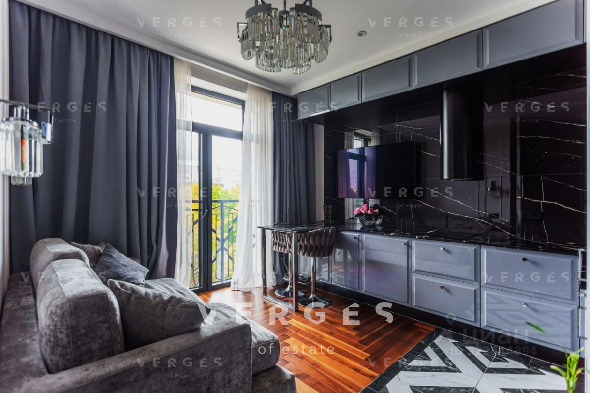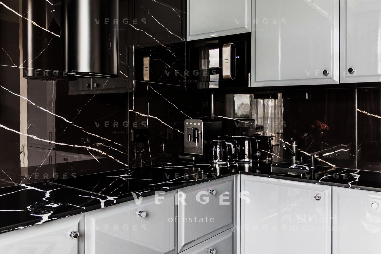 Авторская кухня оснащена полным комплектом мебели и техники.