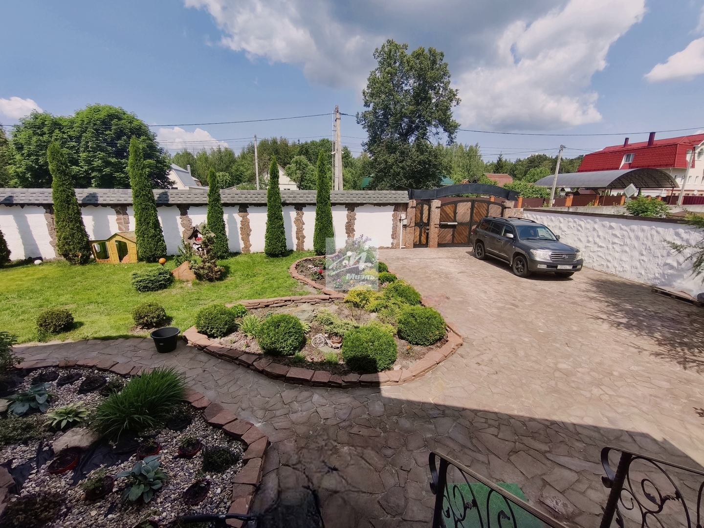 Участок 7, 6 соток с прекрасно выполненным ландшафтом. Огорожен капитальным забором из каменного блока рваной камень. Брусчаткой выполнены дорожки и парковка на 6 авто. Откатные ворота от пульта.