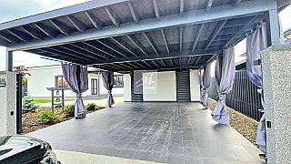 На участке оборудована парковка под арочным высоким навесом, которая позволяет разместить три автомобиля. Выделена и благоустроена зона барбекю.