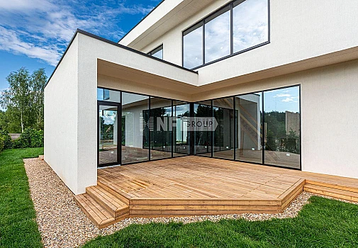 Вся остекление в доме выполнено фирмой KALEVA. Каждый квадратный метр внутри продуман до мелочей. Планировка дома состоит из цоколя, на котором расположены помещения для биллиарда, сауны, санузла, кладовой и технических помещений. На 1 этаже находится кухня-столовая, гостиная с выходом на террасу, 2 спальные комнаты и раздельный санузел с теплыми полами. На 2 этаже расположены 4 просторные спальни, санузел и выход на лоджию или балкон из некоторых комнат.