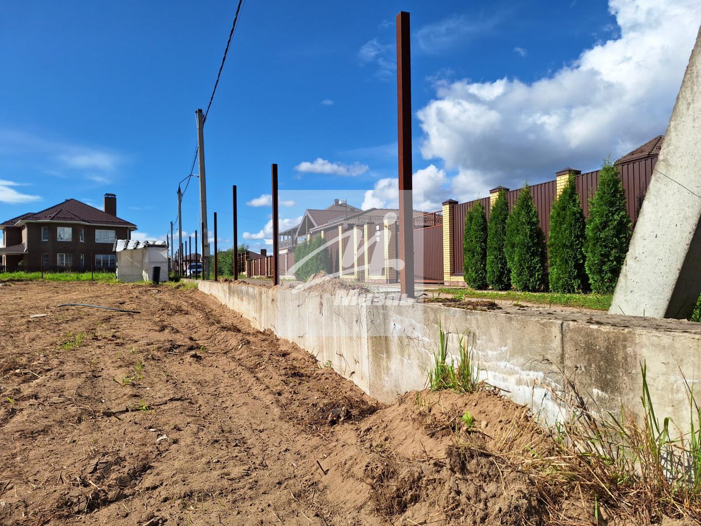 Участок выровнен. По всему периметру участка залит качественный ленточный фундамент под забор (экономия до 300 000 рублей), с одной стороны есть соседский забор из металла, с трёх остальных сторон - металлические столбы под забор, ворота и калитку.