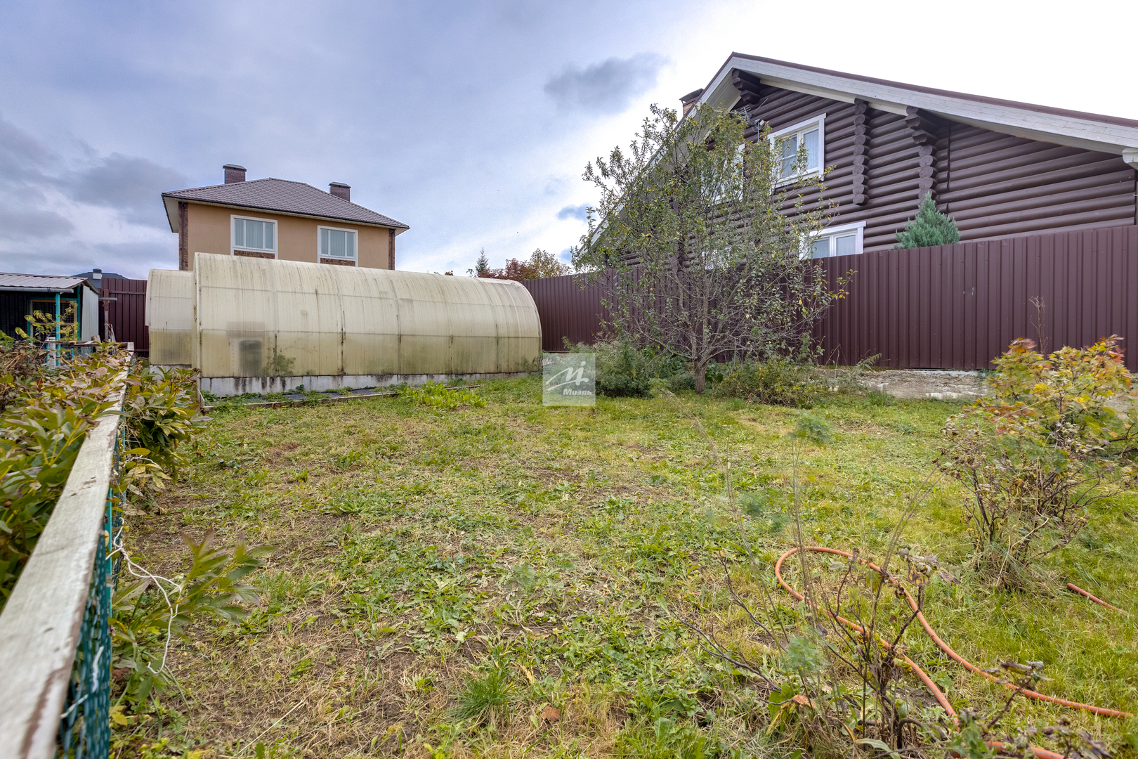 На участке: беседка, вольер для собаки, парники, туи и фруктовые деревья.