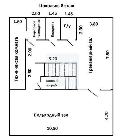 Цоколь: бильярдная, спортзал, комната для хранения вина, два вспомогательных помещения, оборудование для бассейна, с/узел.