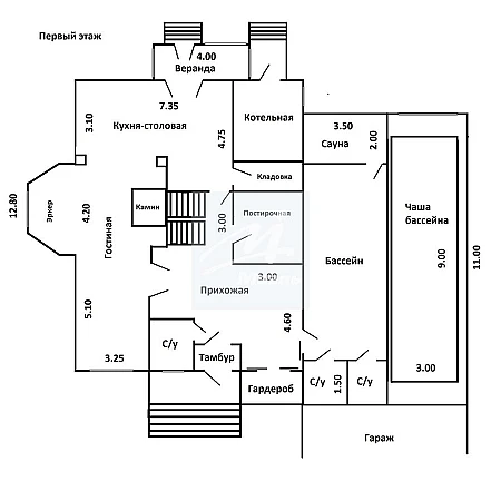 1 -этаж: холл, кухня-столовая с каминным залом и выходом на застекленную веранду, с/узел, гардеробная, постирочная, котельная с отдельным входом, бассейн 9х3, сауна, с/узел в помещении бассейна, гараж на 2 а/м ( на втором этаже гаража расположена полноценная 2-х комнатная квартира для круглогодичного проживания обслуживающего персонала).