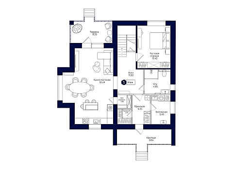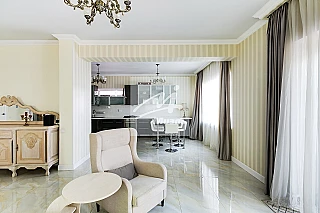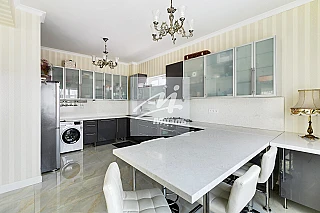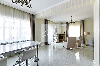 На первом этаже расположены: просторная прихожая с выходом на веранду, большой сан.узел, бойлерная, кухня-гостиная с грамотным зонированием и с настоящим действующим камином, освещена вторым светом. На стенах итальянская штукатурка, полы- плитка с водяным подогревом. Веранда, которая имеет отдельный выход на участок, оборудована зоной барбекю с обеденной зоной.