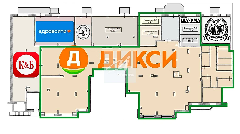 1. Супермаркет "ДИКСИ". Площадь - 536,5 м2. МАП - 6% от РТО (розничный товарооборот), не менее 1 200 000 руб/мес, ДДА (долгосрочный договор аренды) от 21.06.2024 на 10 лет. Индексация 5%