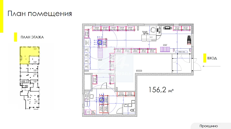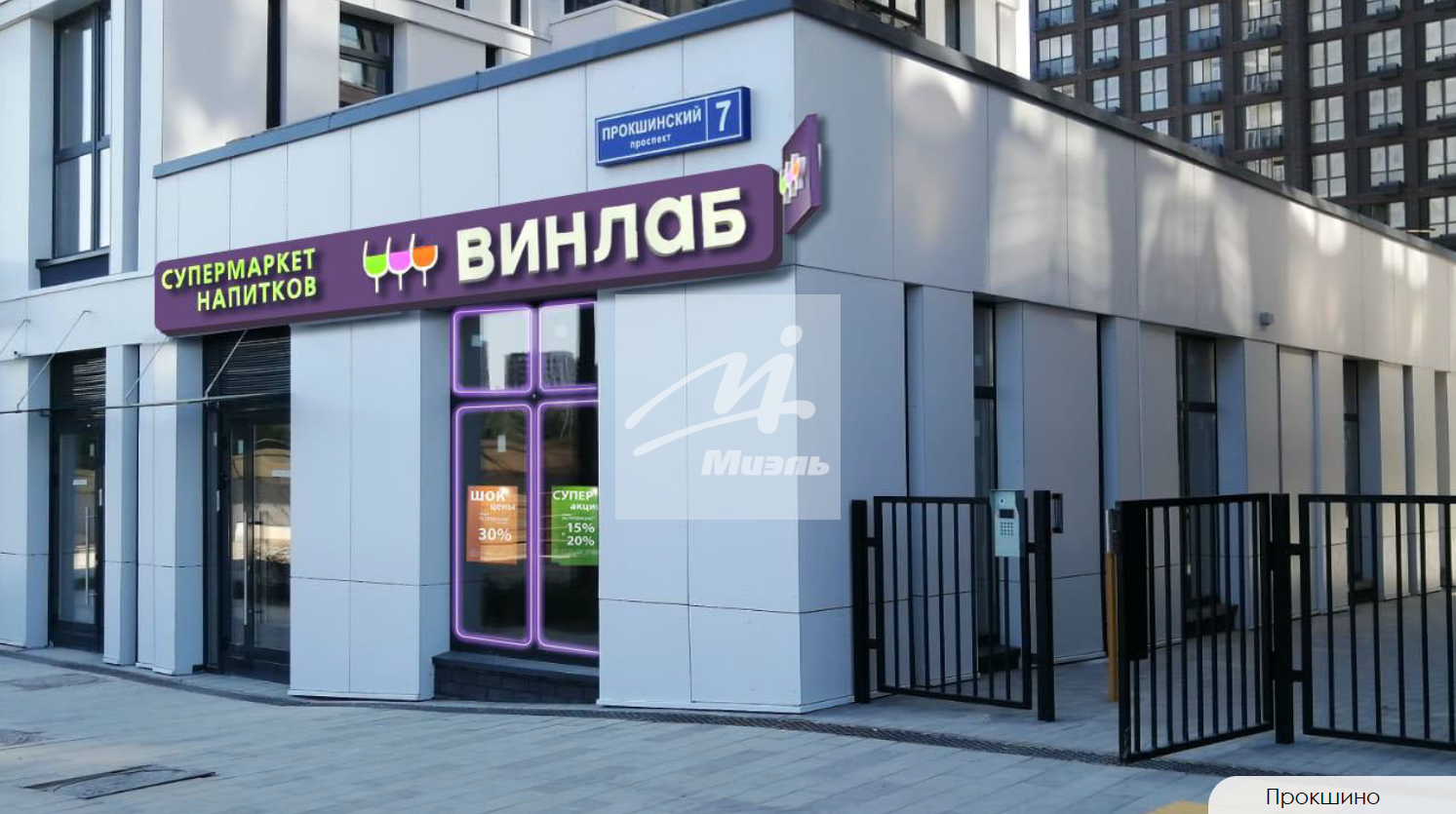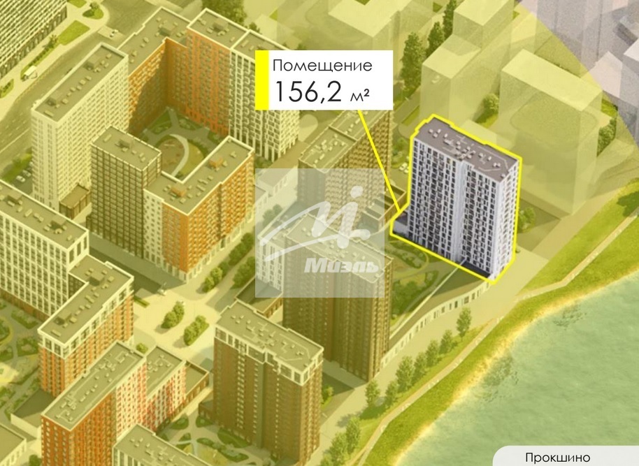 - Помещение в стилобате на входе во двор. Густонаселенный массив, за углом прогулочная набережная, станция метро Прокшино – 750 м.