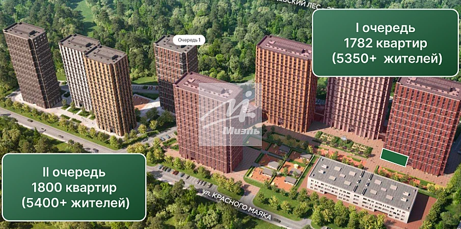 - I-ая очередь (4 корпуса высотой 23 этажа на 1 782 квартиры) + II-я очередь (1 800 квартир, старт строительства 2025г).
