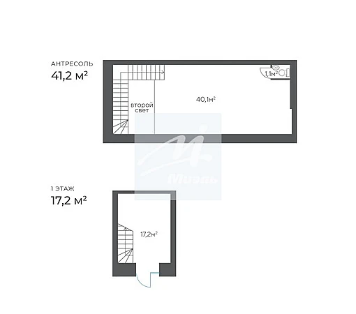- Один этаж и антресоль: 1 этаж - 17,2 м2, антресоль - 41,2 м2.