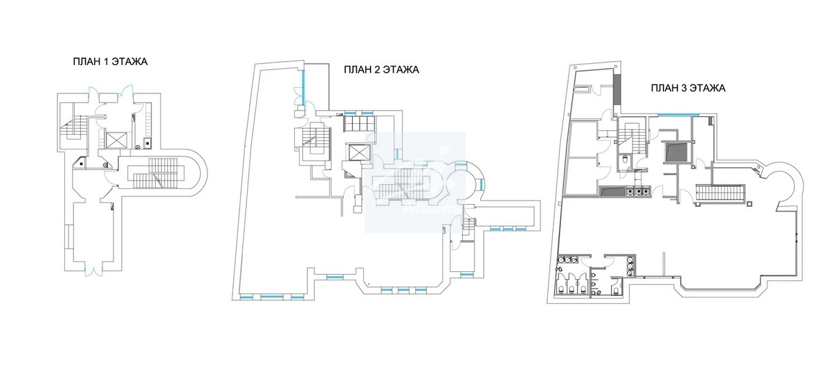 - Общая площадь - 718,3 м2 (1 этаж - 90,8 м2, 2 этаж - 310,3 м2, 3 этаж - 317,2 м2).