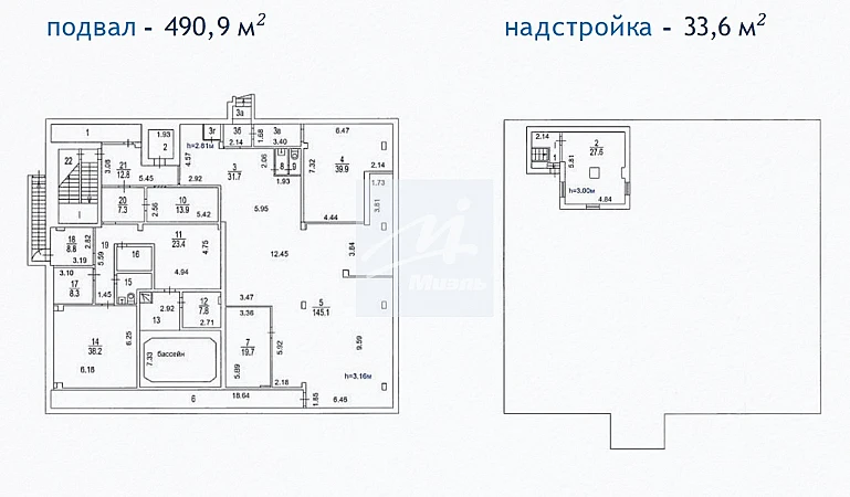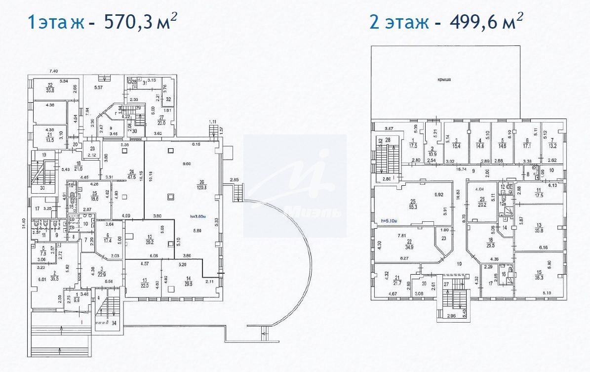 - Общая площадь - 1594,4 м2 (1 этаж - 570,3 м2, 2 этаж - 499,6 м2, подвал - 490,9 м2, надстройка - 33,6 м2).