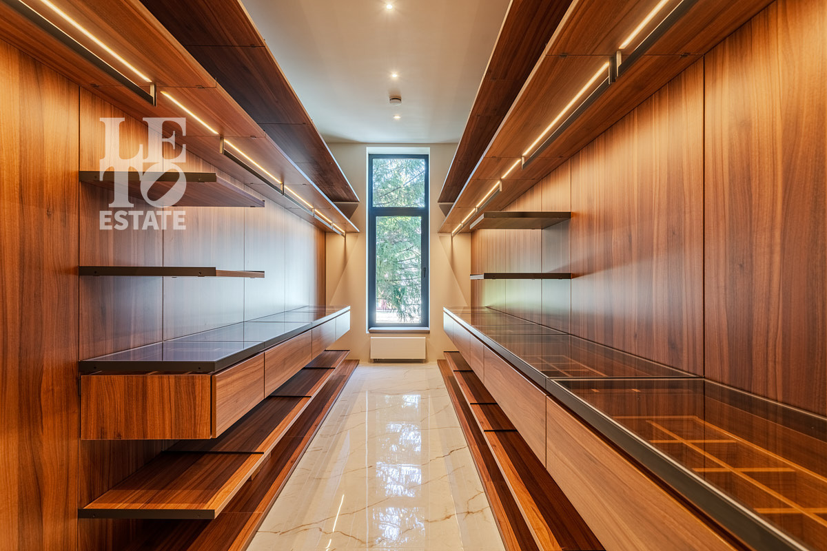 Приватная зона: мастер-спальня 80 м2 (спальня, две гардеробных 18 и 14 кв. м, санузел), три детских площадью 55, 55 и 44 кв. м (четкое зонирование, выделяющее кабинет-игровую-гардеробную, детскую и полноценный санузел с окном, ванной, душевой, умывальником, унитазом и биде), прачечная.