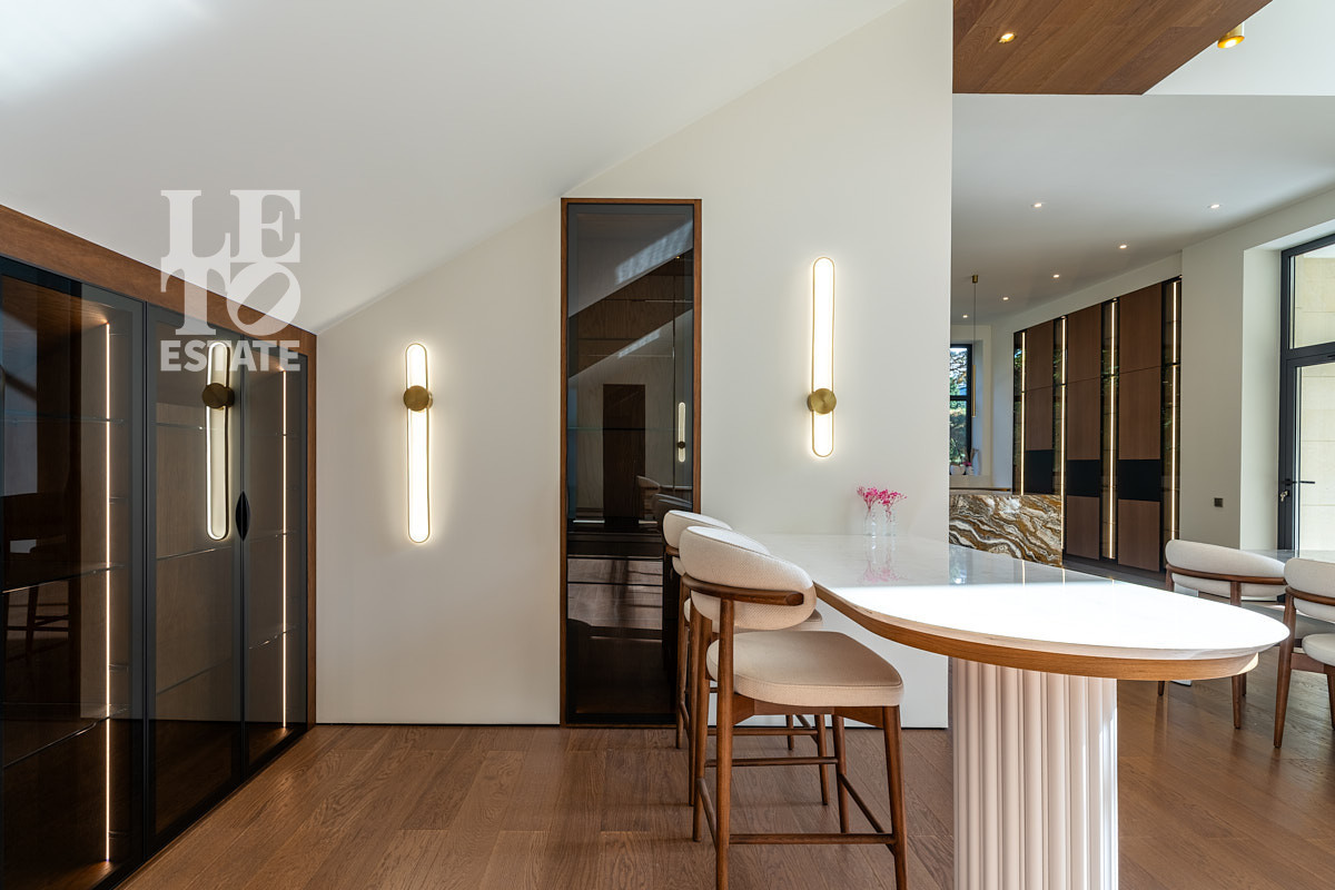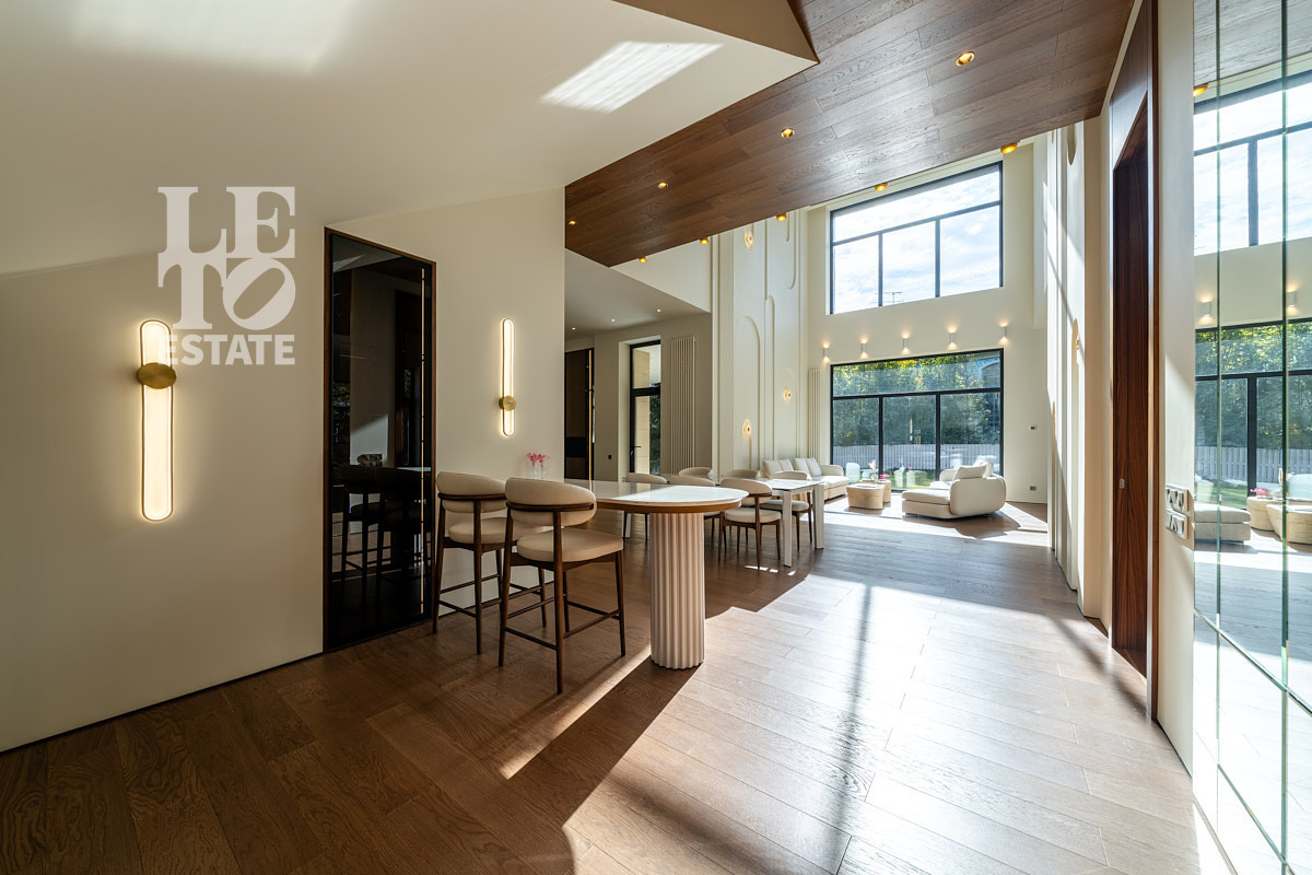 Общественная зона: Гостиная-столовая-кухня - единое пространство со вторым светом, общей площадью 106 кв. м. Выделено 5 функциональных зон: медиа зона с ТВ и дровяным камином, лаунж зона с возможностью размещения двух больших диванов, столовая, с возможностью размещения стола до 20 посадочных мест, зона бара с двумя сервантами и местом под барную стойку, парадная кухня с островом 20 кв. м. с доступом в рабочую кухню 12 кв. м. Окна этого единого пространства ориентированы сразу на три стороны – юго-восток, юго-запад и северо-запад.