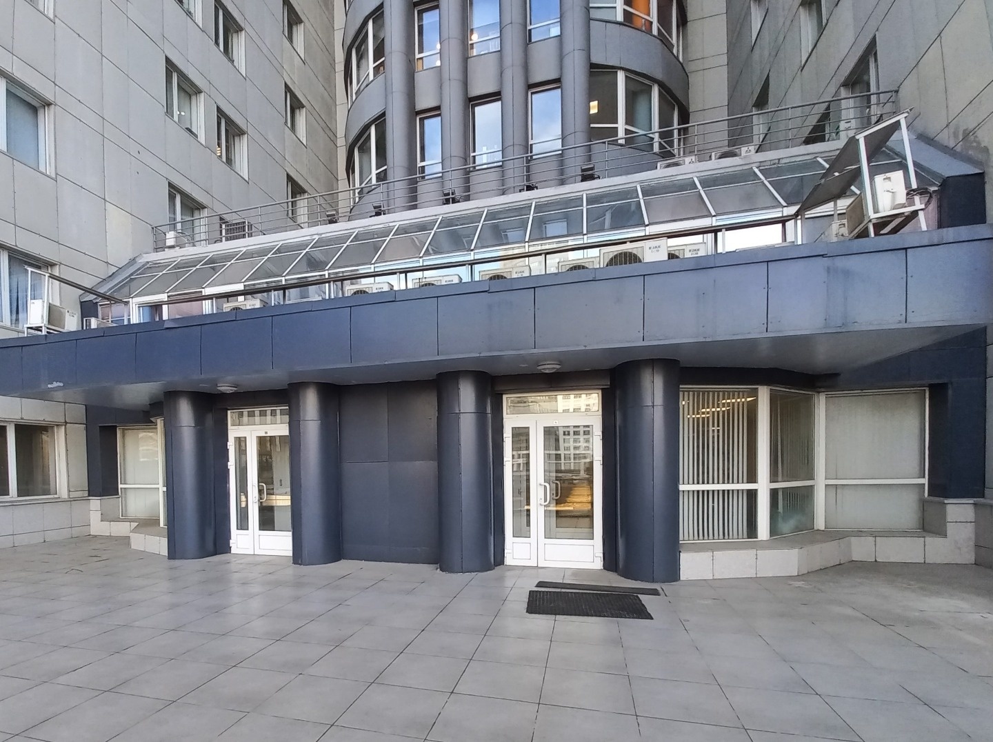 Многоэтажный бизнес-центр обслуживают пять лифтов.