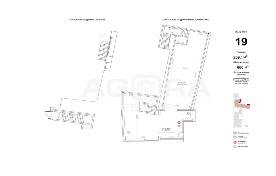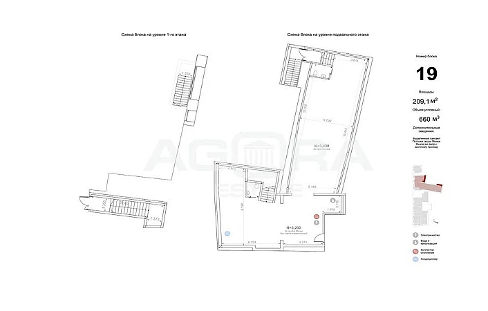 Площадь 209,1 кв.м (на плане - Блок 19). Подвал с отдельным входом с улицы на 1-м этаже. Планировка открытая, высокие потолки, состояние - без отделки.