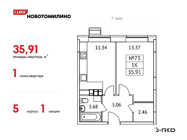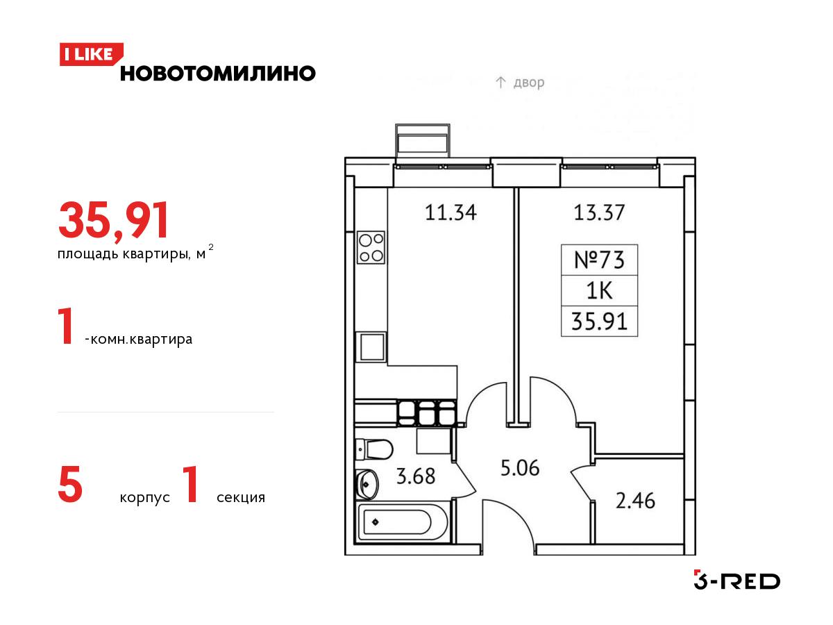 Продается 1-комнатная квартира общей площадью 35,91 кв.м. на 11 этаже 17-этажного дома. Квартира расположена в стильном жилом комплексе «Новотомилино» от застройщика 3-RED. Удобная и практичная планировка дарит максимально широкие возможности для создания интерьера и позволит рационально использовать каждый сантиметр.