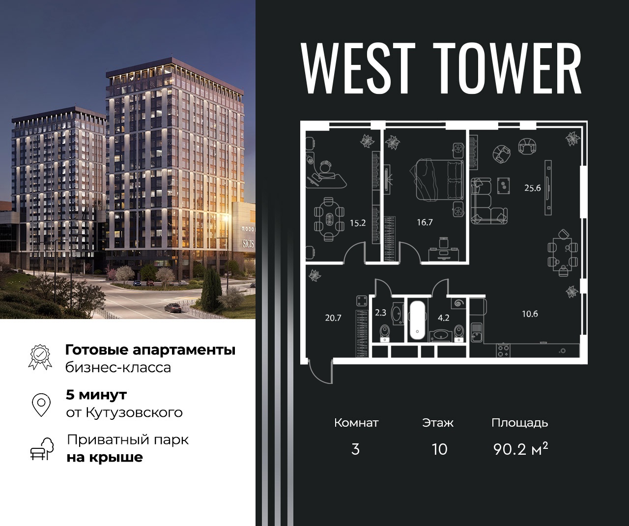 West Tower — апартаменты с премиальным сервисом на Аминьевском шоссе. Развитая инфраструктура и хорошая транспортная доступность. Рядом три станции метро: Аминьевская, Давыдково и Мичуринский проспект. У подножия коплекса находится Природный заказника Долина реки Сетунь, который дополнен собственным парком на крыше.