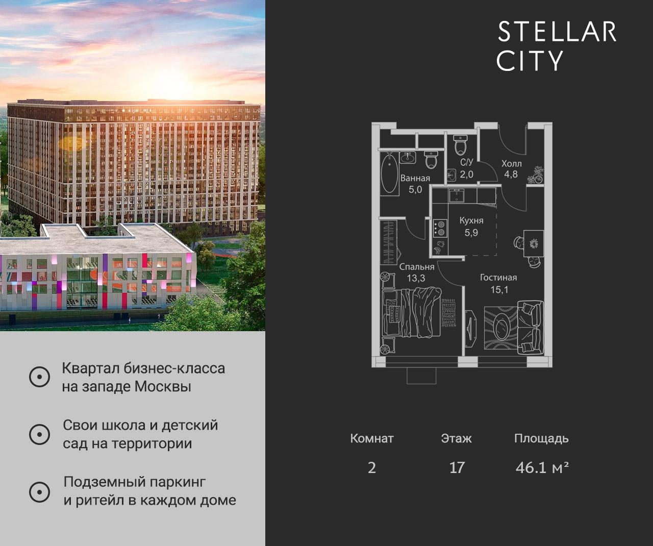 Продается квартира от надежного застройщика Tashir Estate в квартале бизнес-класса Stellar City в ЗАО Москвы. Площадь квартиры составляет: 46.1 кв. м, потолки: 3.1 м Квартира находится на 17 этаже, 4 корпуса жилого квартала Stellar City — микрогорода будущего на орбите Москвы. Stellar City — квартал в ЗАО Москвы вблизи инновационного центра Сколково. В окружении — 11 парков и природных зон, в том числе Долина реки Сетунь, Мещерский лес и парк развлечений The Rink. Город в городеЧтобы дом и инфраструктура вокруг отвечала динамичному лайфстайлу жителя мегаполиса, в основу проекта легла концепция “город в городе”, которая позволяет решать все бытовые вопросы in-home. В квартале будут возведены школа и детский сад, воркаут-зоны, променад, вело‒ и беговые дорожки, детские площадки для каждого корпуса, а также коммерция на первых этажах для ежедневных покупок. Все необходимое — на расстоянии нескольких шагов. Изящные и лаконичные лоббиАвторский дизайн, натуральные материалы в отделке и безупречный интерьер вне времени. Лобби и холлы в проекте бизнес-класса Stellar City ничем не отличаются от входных групп в премиум-сегменте благодаря качественным европейским материалам в отделке, стильному дизайну, консьерж-сервису и уютной зоне ожидания с журнальными столиками и мягкой мебелью. Комфорт и безопасностьЗакрытая территория, охрана, система СКУД, специально разработанное мобильное приложение дома для резидентов и подземный паркинг с круглосуточным наблюдением и доступом с помощью автоматического считывания номера авто.
