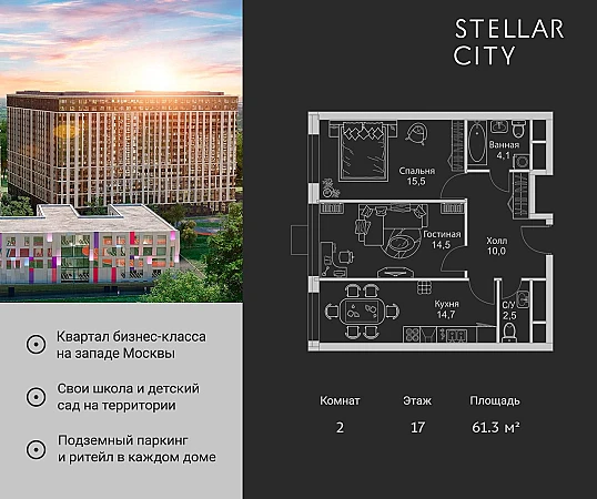 Купить 2к квартиру 61 м² в ЖК Stellar City (Стеллар Сити)