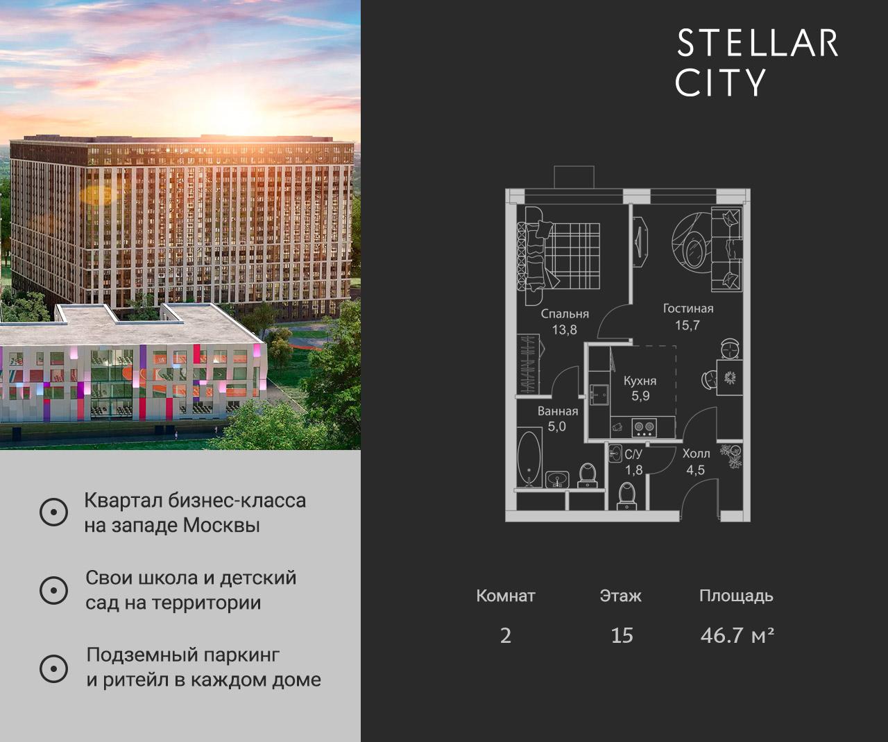 Продается квартира от надежного застройщика Tashir Estate в квартале бизнес-класса Stellar City в ЗАО Москвы. Площадь квартиры составляет: 46.7 кв. м, потолки: 3.1 м Квартира находится на 15 этаже, 4 корпуса жилого квартала Stellar City — микрогорода будущего на орбите Москвы. Stellar City — квартал в ЗАО Москвы вблизи инновационного центра Сколково. В окружении — 11 парков и природных зон, в том числе Долина реки Сетунь, Мещерский лес и парк развлечений The Rink. Город в городеЧтобы дом и инфраструктура вокруг отвечала динамичному лайфстайлу жителя мегаполиса, в основу проекта легла концепция “город в городе”, которая позволяет решать все бытовые вопросы in-home. В квартале будут возведены школа и детский сад, воркаут-зоны, променад, вело‒ и беговые дорожки, детские площадки для каждого корпуса, а также коммерция на первых этажах для ежедневных покупок. Все необходимое — на расстоянии нескольких шагов. Изящные и лаконичные лоббиАвторский дизайн, натуральные материалы в отделке и безупречный интерьер вне времени. Лобби и холлы в проекте бизнес-класса Stellar City ничем не отличаются от входных групп в премиум-сегменте благодаря качественным европейским материалам в отделке, стильному дизайну, консьерж-сервису и уютной зоне ожидания с журнальными столиками и мягкой мебелью. Комфорт и безопасностьЗакрытая территория, охрана, система СКУД, специально разработанное мобильное приложение дома для резидентов и подземный паркинг с круглосуточным наблюдением и доступом с помощью автоматического считывания номера авто.
