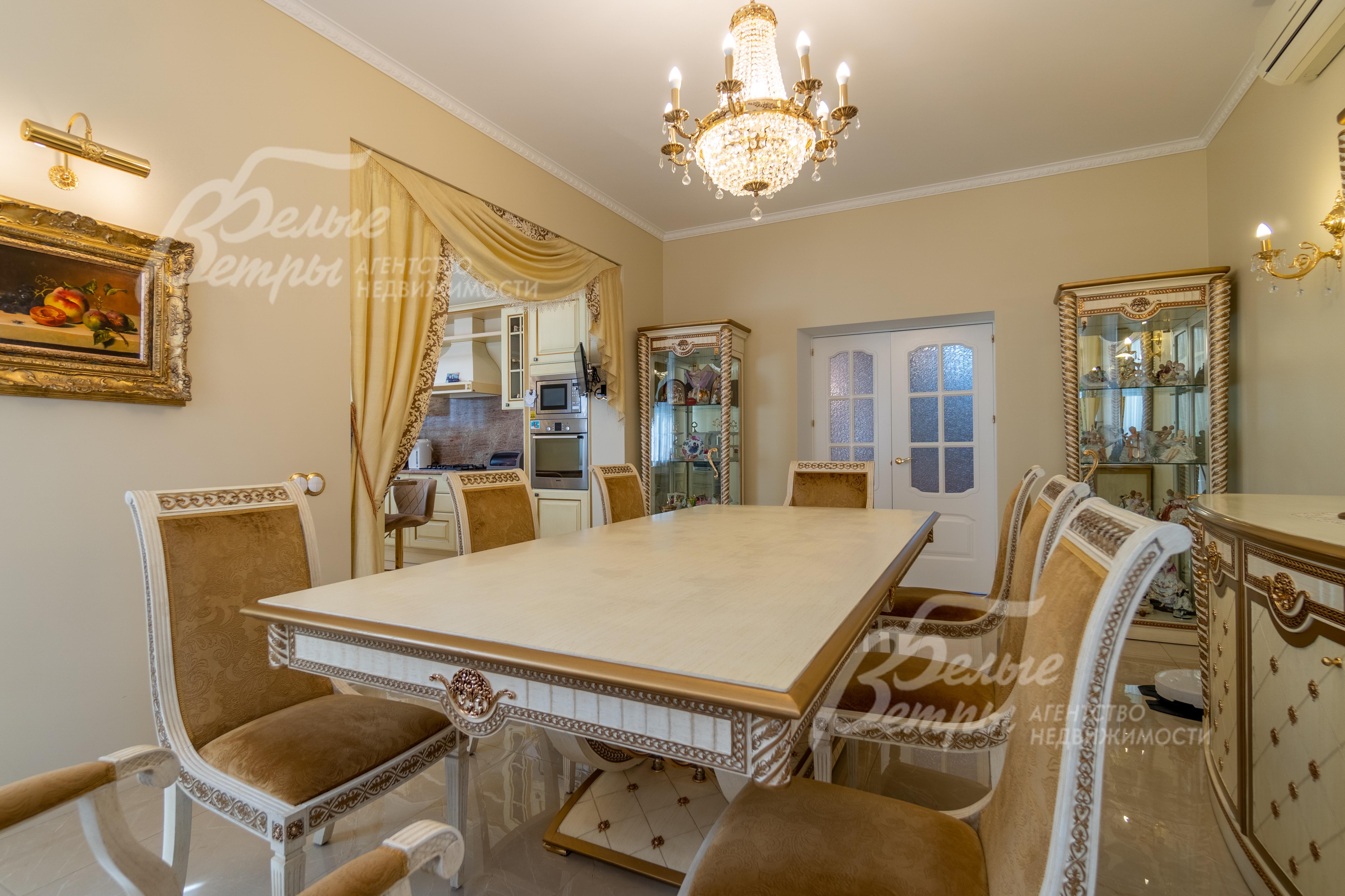 Мебель, оборудование: все комнаты укомплектованы роскошной итальянской мебелью в классическом стиле или барокко. Установлен кухонный гарнитур со столешницей из натурального гранита со встроенной газовой плитой, встроенная духовка и микроволновка BOSH, холодильник LIEBHERR, полубарный остров со столом и стульями 4 шт., обеденная группа из массива дерева. Большое арочное зеркало в холле, телевизоры, диваны, изящные журнальные столики и консоли и комоды. В двусветной гостиной многоярусная хрустальная люстра, окна украшены шторами с ламбрекенами, на полу ковер..