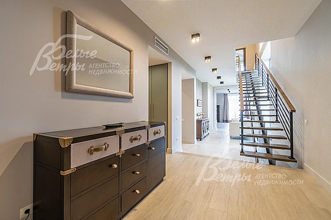 Внутренняя отделка: дизайнерская отделка в современном стиле: комбинированная отделка стен-покраска и вставки из высококачественных обоев, на полу итальянская плитка и инженерная доска. Дубовая лестница. Двери - натуральный шпон. Потолки окрашены, разноуровневые. Встроенные шкафы и гардеробные..