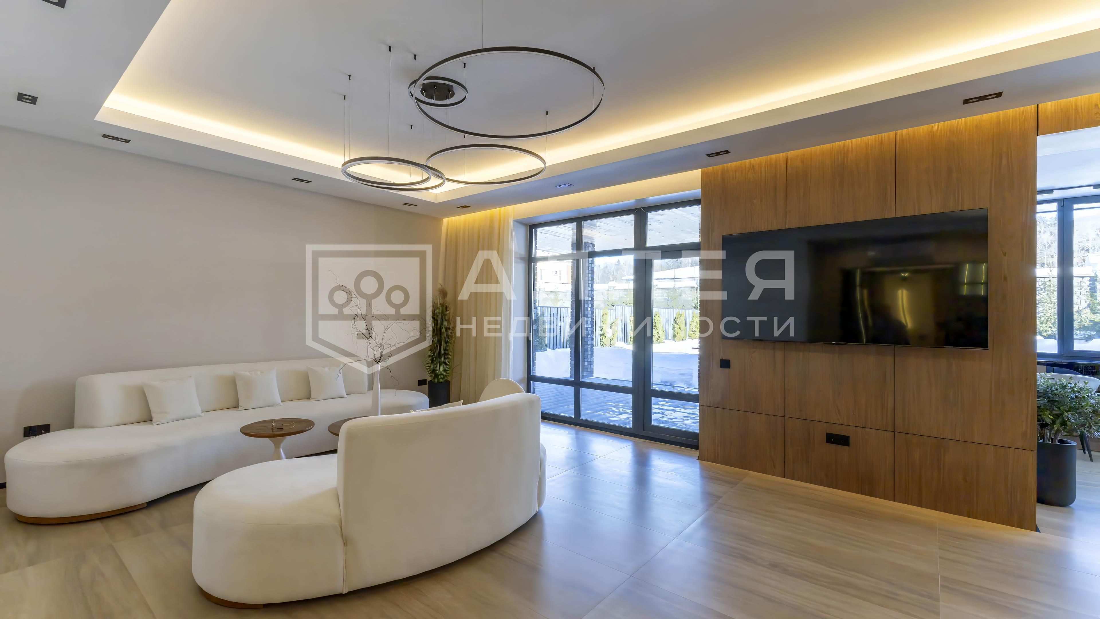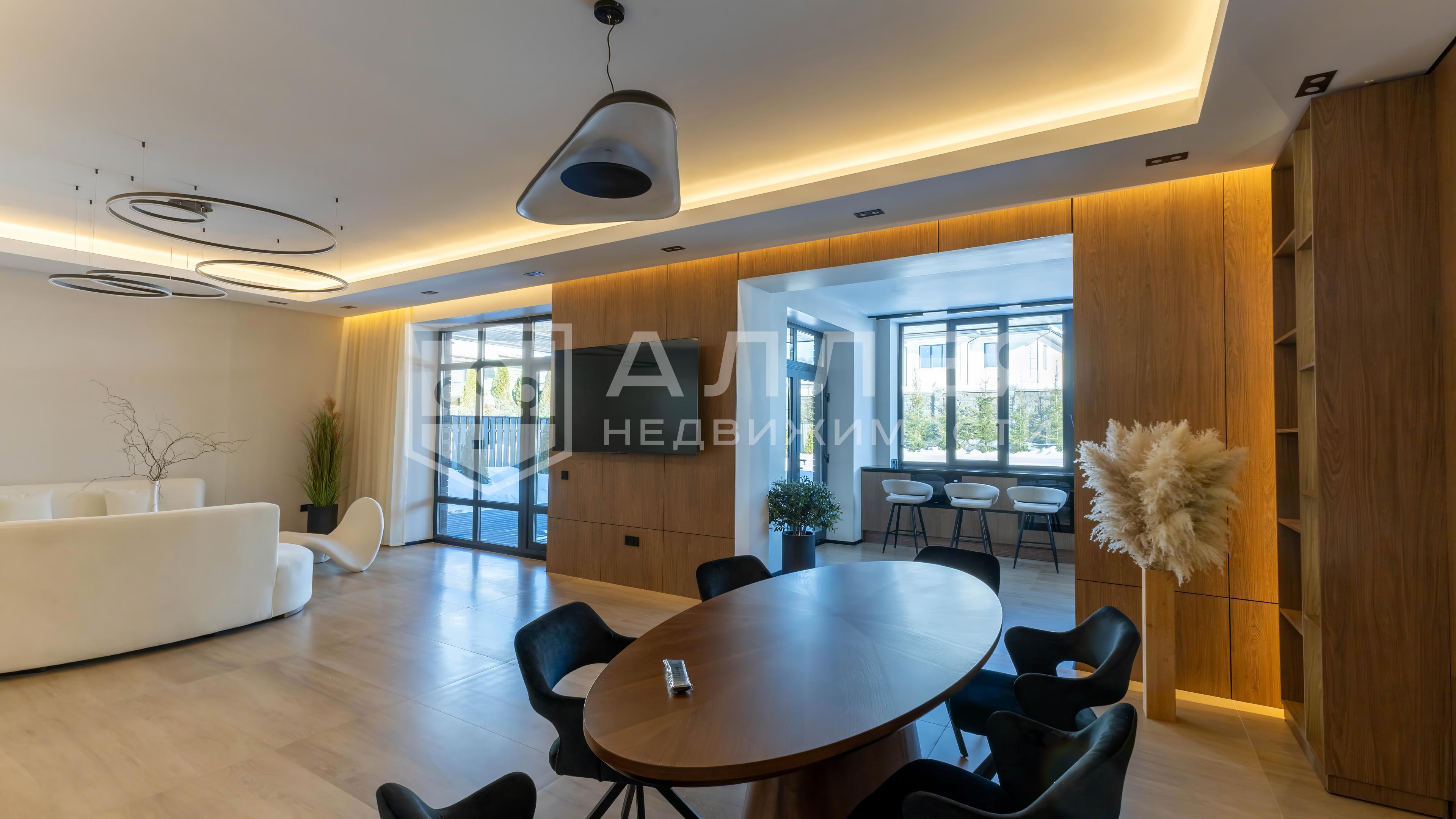 Важные опции: бассейн (фитнес-центр на территории КП); квартира для персонала (с отдельным входом); терраса (22 кв.м); машиномест крытых: 2; кабинет, панорамные окна в пол.