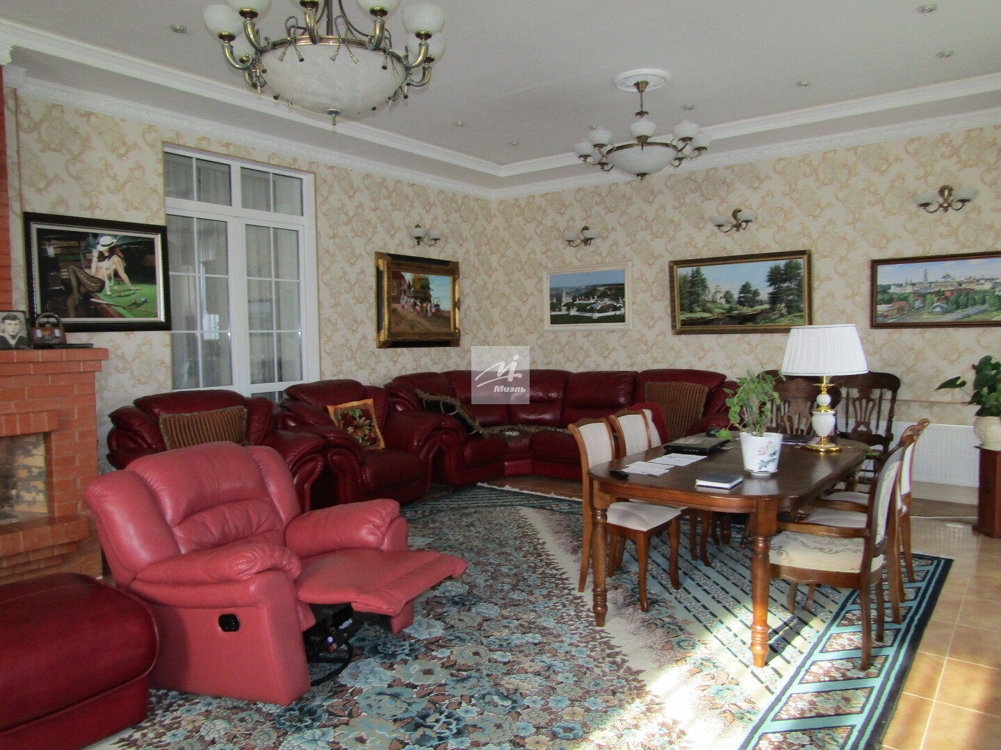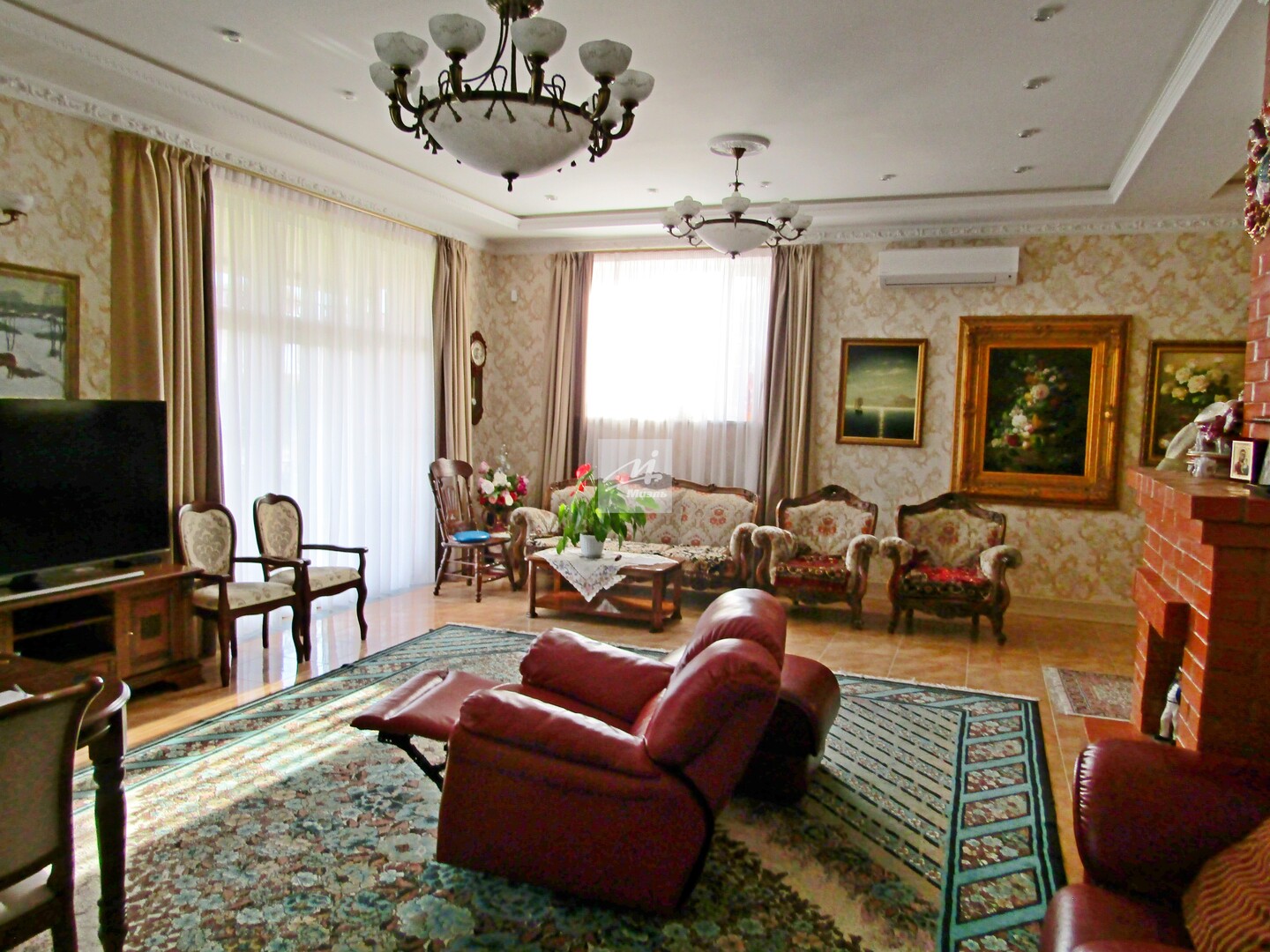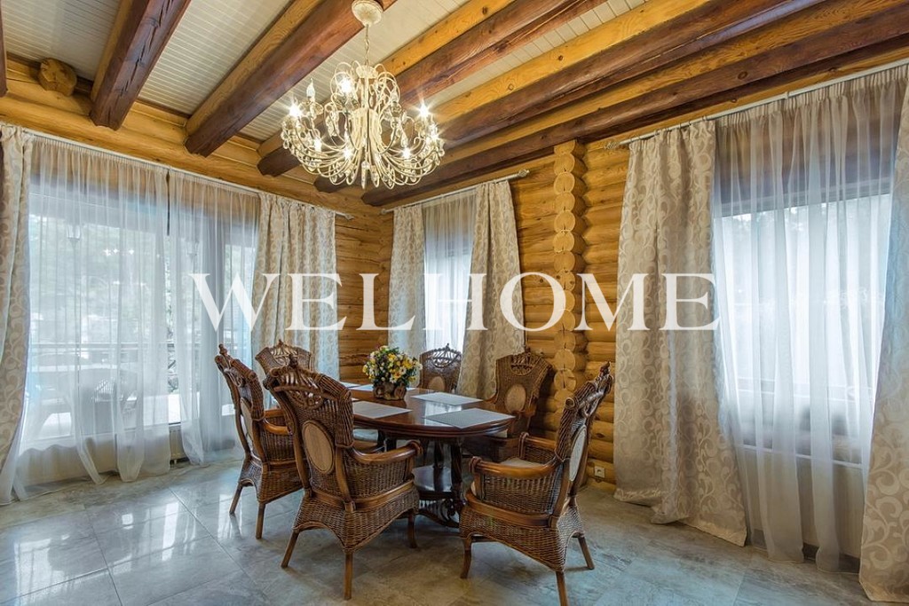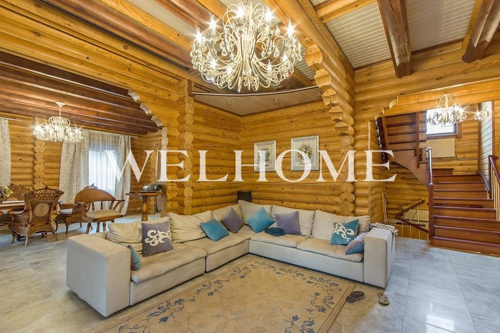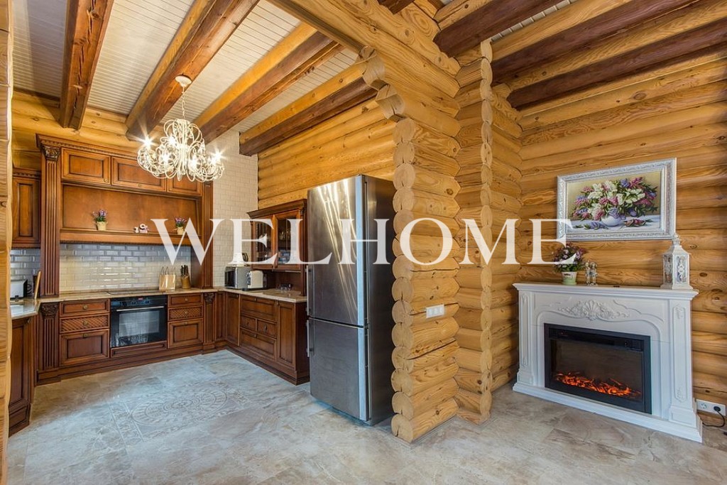 Кухня с современным классическим гарнитуром из массива, большая и светлая гостиная с натуральным дровяным камином, санузлы с качественной сантехникой.