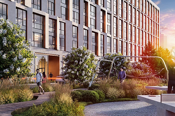 Внутренние дворы урбан-блоков жилого квартала PRIDE наполнены светом благодаря переменной этажности. Внутридомовые площадки разделены на тематические зоны: детские, спортивные и тихие для работы и отдыха.