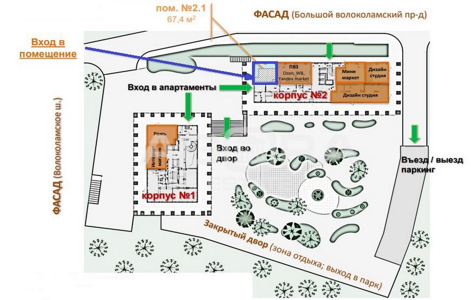 Льготные условия! Аренда торгового помещения площадью 67,4 м2 (42,8 м2 +24,6 м2 антресоль), расположенного на 1-м этаже в комплексе апартаментов Байрес (на плане - помещение № 2.1 во 2-м корпусе). Панорамное остекление, состояние - без отделки. Помещение имеет отдельный вход. Электричество 15кВт. Высота помещения 8,4 м, что позволило сделать антресоль и увеличить площадь. Подходит для кафе, салона красоты, шоу-рума, сервисного центра, магазина. При организации кафе возможна дополнительная рассадка посетителей на улице в аркаде.