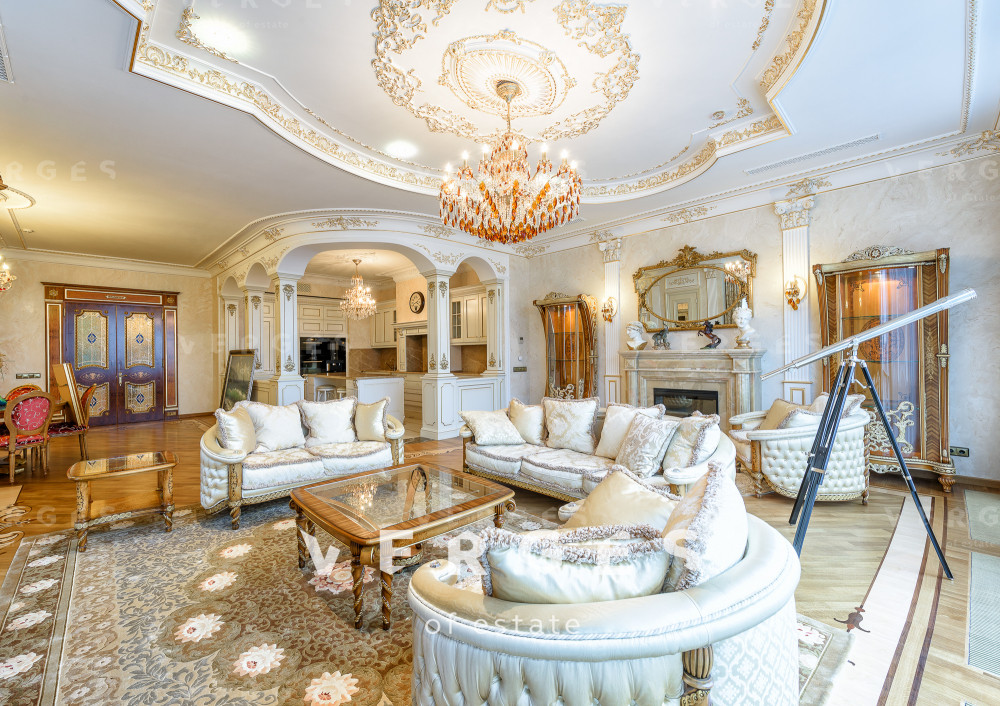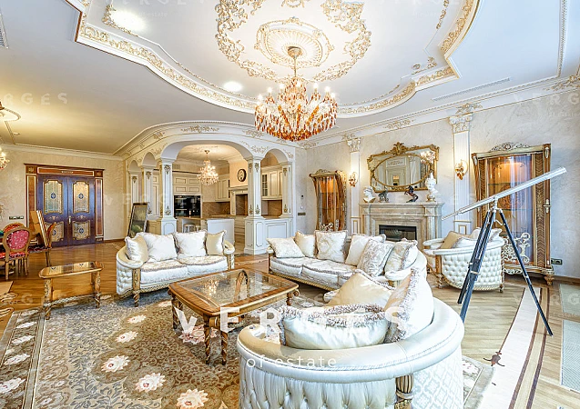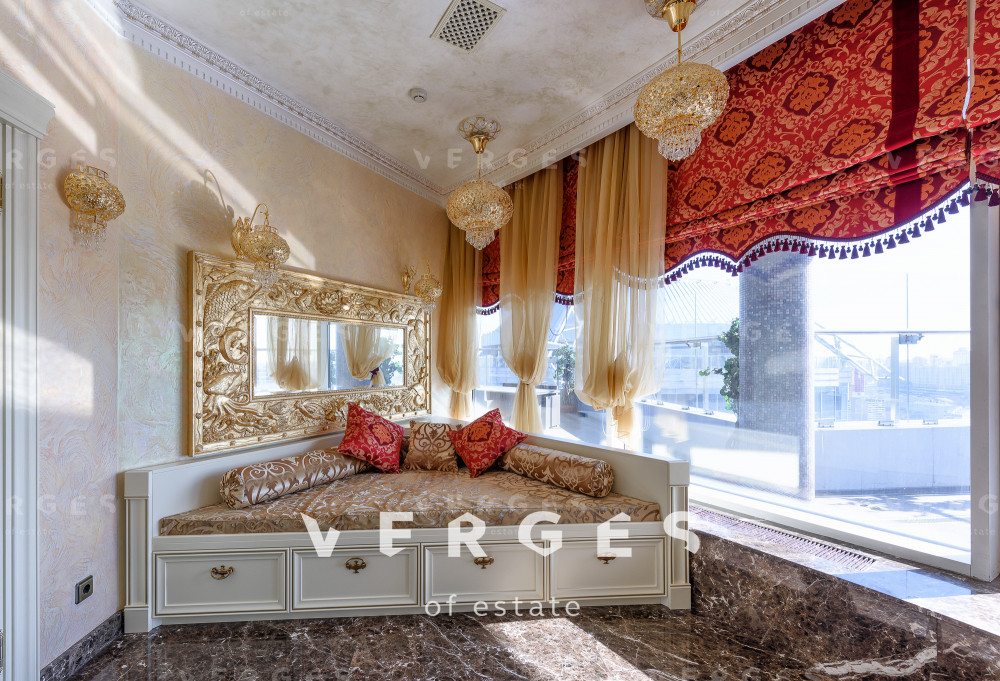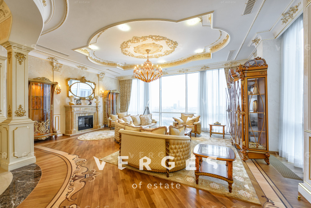 В жилом комплексе Кутузовская Ривьера предлагается в продажу великолепный двухуровневый видовой пентхаус, с прекрасными панорамными видами на Москву. Пентхаус имеет функциональную планировку, 4 спальни, и панорамные окна. Дизайнерская отделка выполнена в классическом стиле. Все полы из мрамора наивысшего качества, с подогревом. В гостиной и холлах выложен художественный паркет. Установлена отдельная приточно-вытяжная система вентиляции и кондиционирования Daikin. Обогрев полов системой Mihlenhoff. Вся бытовая техника Miele. Первый уровень - прихожая, просторный холл, две гардеробные комнаты, санузел. Кухня, столовая и зал объединены в единое пространство. Установлен камин с красивым порталом из оникса Килиманджаро. На первом этаже расположен стильный кабинет, в отделке использован черный лак. Отдельно зонированы две спальни, санузел и постирочная с душевой. На втором уровне расположена хозяйская спальня с отдельным выходом на террасу. Ванная комната при спальне имеет душ и джакузи с хромотерапией (восемь видов массажа, включая спортивный и релакс). Из спальни есть выход в большую гардеробную. Также на втором этаже есть сауна с хромотерапией и комнатой отдыха и сан узлом. Комната отдыха имеет также выход на террасу. Терраса - 100 кв. м. (50 кв.м. находится под крышей). Безопасное остекление, полы керамогранит. Обставлена всесезонный мебелью из искусственного ротанга. Отдельно в хозблоке на террасе аксессуары для мебели подушки и пледы. Мебель Италия фабрика Riva, Asnagi, Franchesco Molon. Освещение Mechini, Sferon. В стоимость пентхауса входят 2 машиноместа в подземном паркинге. ЖК Кутузовская Ривьера жилой комплекс класса премиум, расположен по адресу: г. Москва, ЗАО, ул. Нежинская, д. 1, корп. 1,2,3,4, - между природным заказником Долина реки Сетунь и Волынским лесопарком, недалеко от Кутузовского проспекта. Территория жк свободна от автомобилей, обустроена ландшафтным парком с беседками, скамейками, детскими и спортивной площадкой. Особенную гордость представляет рукотворная речка с несколькими группами фонтанов. Большая площадь панорамного остекления, рациональные планировки, высота потолков 3,1 м, бесшумные скоростные лифты Shindler, лобби корпусов с высокими потолками и межквартирные холлы отделаны деревом, металлом и мрамором Имперадор. Инфраструктура: ресторан изысканной кухни с румсервисом, мультисервис химчистка, детский сад, фитнес студия, салон красоты, автомойка с шиномонтажем. Единый четырехуровневый подземный паркинг (доступ лифта на всех уровнях), огороженная охраняемая территория.
