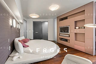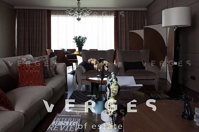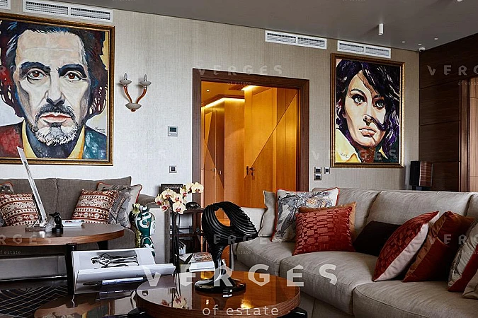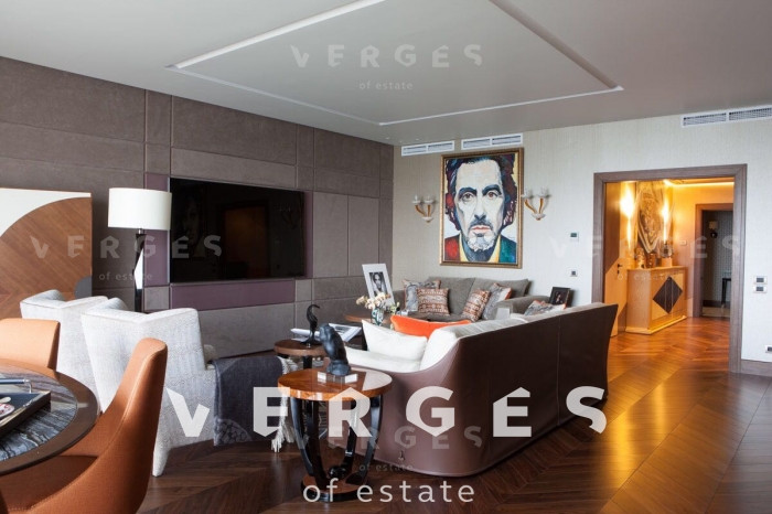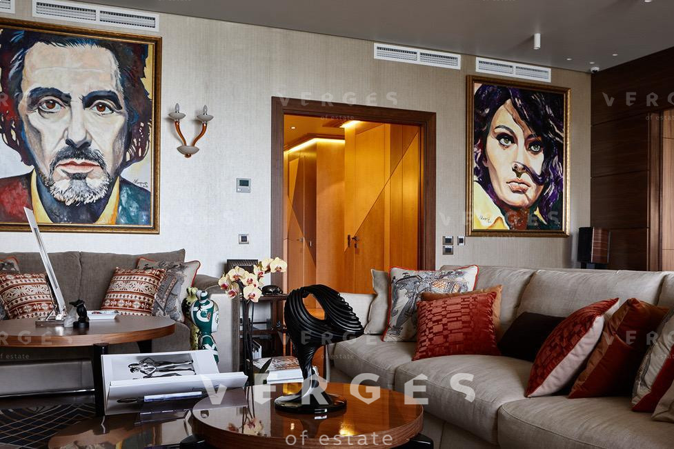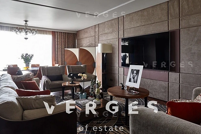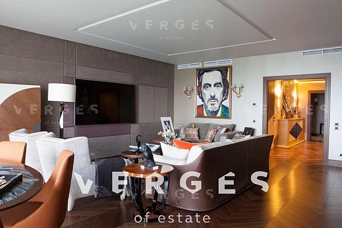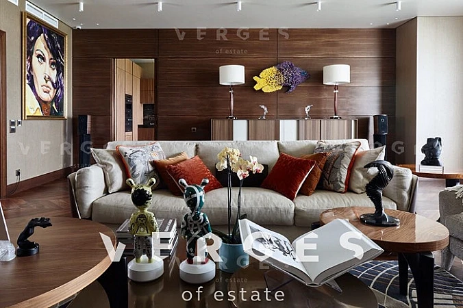 Квартира с уникальной дизайнерской отделкой отделкой в современном стиле. Хозяйская спальня (42 кв.м.) со своим санузлом и гардеробной (гардероб полностью выполнен из клена), детская спальня (44 кв.м.) со своей гардеробной и отдельным санузлом, детская комната (30 кв.м) так же со своей гардеробной и санузлом, просторная гостиная-столовая (56 кв.м.), отдельная зона кухни (18 кв.м.), постирочная, кладовая. Полностью укомплектована всей необходимой мягкой мебелью (диваны и кровати - Fendi, прочая мебель - Giorgetti, Minotti) и встраиваемой техникой на кухне - Miele (посудомойка, микроволновая печь, духовка, пароварка). Гарнитура на кухне компании Sicis (Италия) с умными доводчиками и электроприводом полок и ящиков. Стол обеденный с эксклюзивной мраморной столешницей из Италии фирмы Aniballe Colombo, стулья Maxalto (эксклюзивной работы с обивкой из ткани фирмы Hermes). На полу - паркет из американского ореха Select, мрамор в санузлах из Италии, ковры из шелка и шерсти от ведущих компаний Австралии и Америки. Настенная мозаика от фирм Sicis и Bezana. Обои в комнатах Hermes - шелковые английские и американские бумажные. Шторы, покрывала из ткани Hermes Loro Piana. Настенные панели в гостиной из американского ореха и кожи алькантары. Сантехника в санузлах от ведущих немецких производителей. В квартире установлены системы: встроенный домашний кинотеатр; умный дом с управлением через iPad (объединение всех систем квартиры: освещение, шторы, музыка, сценарии, камеры видеонаблюдения, датчики протечек и т.д.); своя система кондиционирования, увлажнения и очистки воздуха, фильтрации всей воды в квартире.