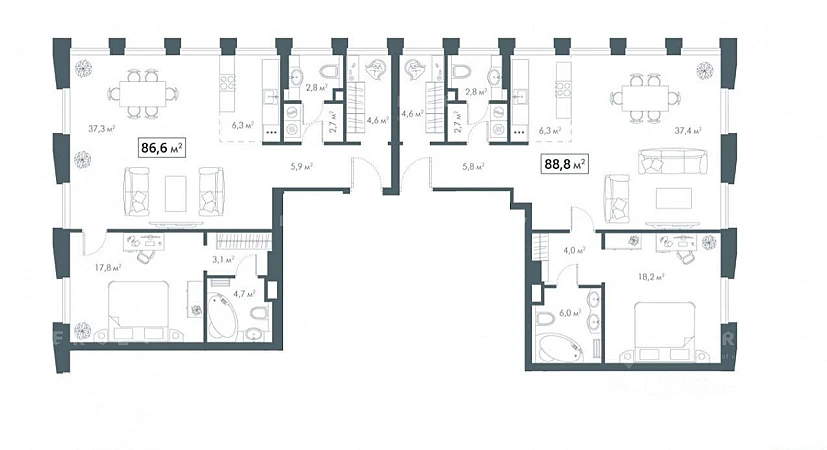 В ЖК White Khamovniki продажу предлагаются две квартиры под объединение общей площадью 175,4 кв.м. (86,6 кв.м. + 88,8 кв.м.) Обе квартиры предлагаются с дизайнерской отделкой в стиле Grey, с применение натуральных материалов: - на полу паркетная доска из натурального дуба премиального бренда Siberian Floors Prime - в ванной и санузле использован керамогранит фирмы Archskin Pietra di Savoia Perla, раковина из натурального камня, смесители Dornbracht VAIA. В данный момент функционал каждой квартиры: Кухня - гостиная 37 кв.метров, мастер спальня со своей гардеробной зоной и ванная комната, гостевой санузел с зоной для постирочной и гардеробная при входе для верхней одежды. При объединении возможно спланировать 3-4 спальни, 3 санузла, гардеробные комнаты, зону гостиной, кухню-столовую.