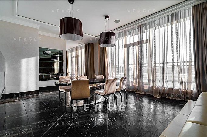 Просторная 7-комнатная квартира с роскошными видами, площадью 404.8 кв. м. с первоклассным ремонтом. По задумке архитекторов имеется внушительных размеров полноценная гостиная, кухня - столовая, комфортабельные мастер - блоки, где можно спокойно отдохнуть после тяжелого рабочего дня со всеми удобствами, не отвлекаясь на суету мегаполиса, Комната йоги, комната няни, кабинет, 4 спальни, 5 гардеробов, зона СПА, 6 санузлов, высокие потолки 3.6 м. Одним из главных преимуществом квартиры Вашей мечты является прекраснейший панорамный вид все четыре стороны света сквозь множество окон на центр Москвы! Изо дня в день Вы сможете любоваться изумительным видом из собственной большой террасы 88 кв. м. Отделка выполнена в современном стиле с элементами ар - деко.