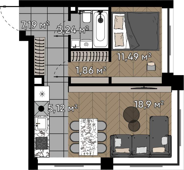 Стадия строительства — монолит готов, высокая стадия готовности, сдача в 2027 году. Проект также подходит под инвестиционные сценарии. Предусмотрена временная регистрация.