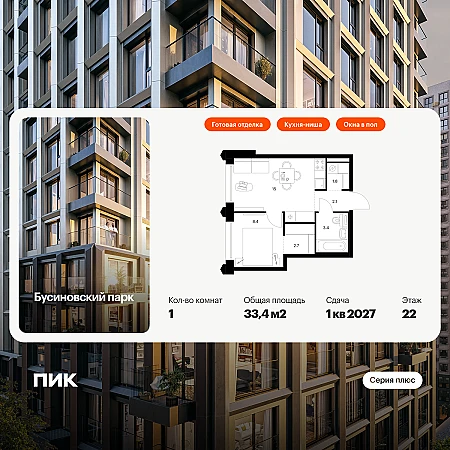 Продаются 1-к апартаменты площадью 40.3 кв.м. на 15-м этаже 29 этажного дома в "NAMETKIN TOWER" от ГК ОСНОВА.