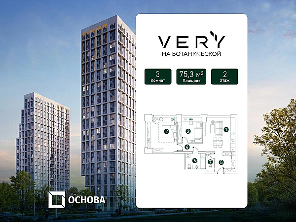 Продается 3-к квартира площадью 75.3 кв.м. на 2-м этаже 31 этажного дома в ЖК "Very" от ГК ОСНОВА.